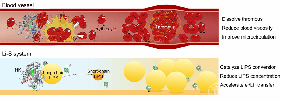 近日,受纳豆激酶(NK)溶解血栓和改善血液微循环功能的启发,少妇白洁 杨植教授、杨硕副教授团队与中国科学技术大学江俊教授团队联合开发了一种高效的多硫离子转化仿生酶用于碳纳米管负载硫正极——NK及其肽基模拟酶(丝氨酸-组氨酸-天冬氨酸三联体活性中心,Ser-His-Asp)。密度泛函理论计算、原位光谱和电化学分析,揭示了其独特的催化机制:天冬氨酸(Asp)强电负吸附固定LiPSs,丝氨酸(Ser)电子轴拉伸催化S-S键断裂,组氨酸(His)亲锂位点促进电荷/Li⁺传输。通过机器学习优化配方,该催化剂显著提升了贫电解液条件下的SRR动力学,实现高倍率容量(744 mAh g⁻¹,5 C)、长循环寿命(250圈容量衰减率0.096 %)和高面积容量(8.87 mAh cm⁻²,E/S=4 μL mg⁻¹)。这一研究结果从生物酶到电化学,跨界创新,重新定义了锂硫电池催化的未来。