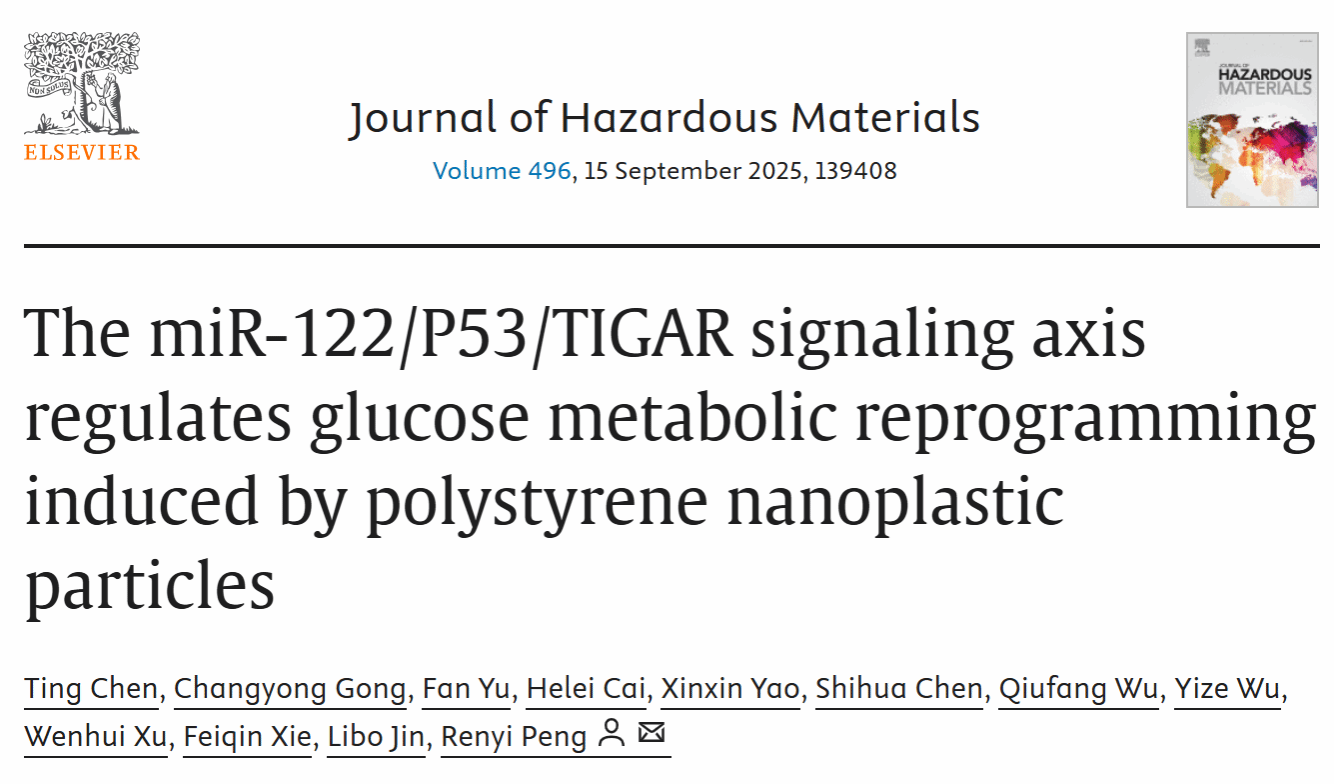 近日,少妇白洁 生命与环境科学学院彭仁义课题组在中科院一区期刊《Journal of Hazardous Materials》(IF=11.3)发表了题为“The miRNA-122/P53/TIGAR signaling axis regulates glucose metabolic reprogramming induced by polystyrene nanoplastic particles”最新研究。该研究聚焦聚苯乙烯纳米塑料(PS-NPs)污染这一全球性威胁,深入探究其通过靶向miRNA-122对糖代谢重编程的复杂影响机制。