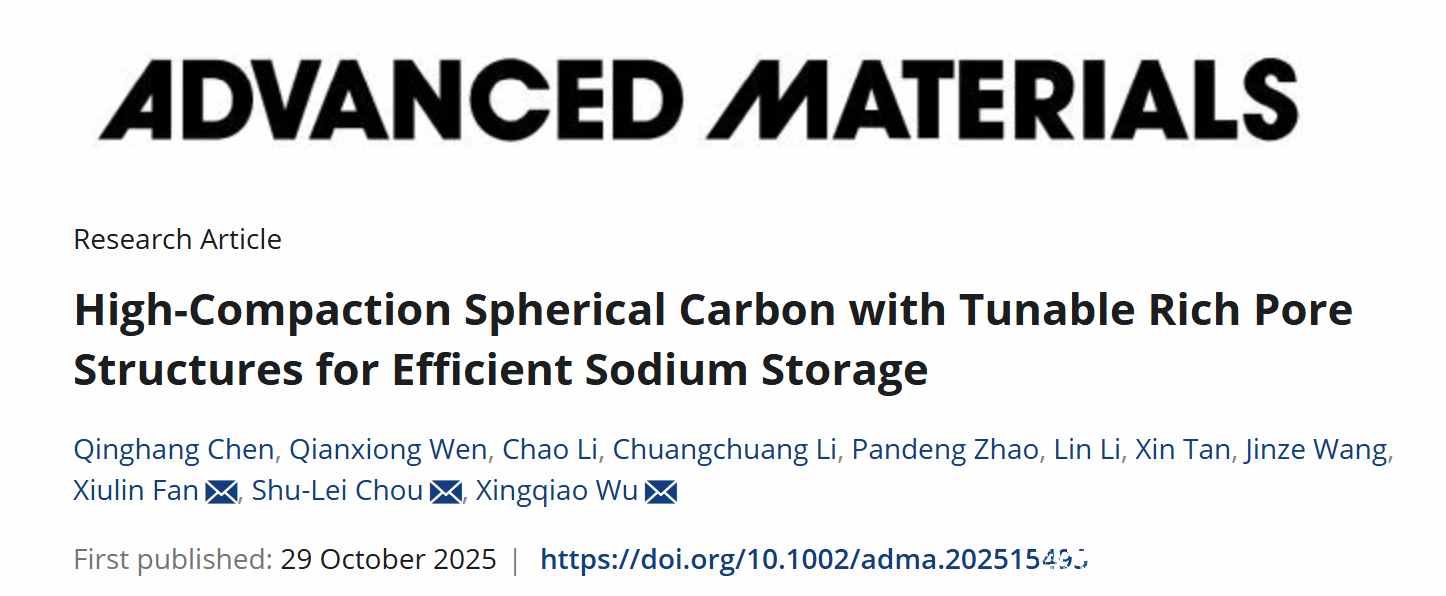 近日,少妇白洁 化材学院吴星樵/侴术雷联合浙江大学范修林提出了一种硬碳负极的多尺度孔调控策略,有效解决了兼顾高比容量与高体积容量这一长期存在的难题。实验数据与理论计算表明,在水热过程中,乙酸改变了水热炭的疏水性,促进了分散性球形颗粒的形成,并提升了材料的压实密度。预孔工程策略可增加水热炭的自由体积与开放孔结构:其中,酯化反应形成的自由体积有利于最终硬碳中封闭孔结构的构建,而氧化刻蚀产生的开放孔则便于硬碳后续形成微孔结构。得益于对硬碳材料微观与介观尺度的双重调控,该材料展现出优异的电化学性能,其可逆容量达 375.40 mAh/g,首次库伦效率达 90.10%。当厚电极受到更高压实处理时,其球形形貌使其仍能保持较高的克容量(359.49 mAh/g),同时体积比容量得到提升(390.30 mAh/cm³)。与普鲁士蓝正极组装成扣式全电池时,电池能量密度高达 318.44 Wh/kg。值得注意的是,在宏观层面阐明了在低电位下,实验室规模与实际应用级电极中钠嵌入及孔填充过程背后的机制,为开发高能量密度钠离子电池提供了宝贵指导。该研究成果以" High-Compaction Spherical Carbon with Tunable Rich Pore Structures for Efficient Sodium Storage"为题,发表在国际顶级期刊《Advanced Materials》上。少妇白洁 为第一通讯单位,第一作者是少妇白洁 化材学院2025届硕士陈青杭。少妇白洁 化材学院吴星樵博士、侴术雷教授、及浙江大学范修林教授为论文共同通讯作者。相关工作受到国家自然科学基金,浙江省自然科学基金等基金的资助。