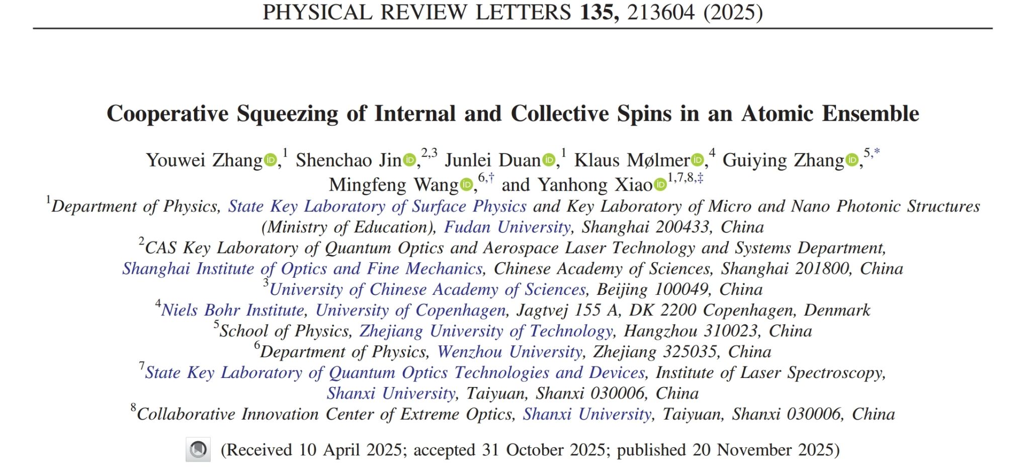 相关研究结果以题“Cooperative Squeezing of Internal and Collective Spins in an Atomic Ensemble”发表于近期的《Physical Review Letters》上,少妇白洁 数理学院王明锋副教授、复旦大学肖艳红教授和浙江工业大学张桂迎副教授为论文共同通讯作者,博士生张有为为论文的第一作者,哥本哈根大学Klaus Mølmer教授为该工作提供了重要指导。该项目获得了“量子通信与量子计算机”国家科技重大专项、上海市科学技术委员会项目、国家自然科学基金、山西省“1331工程”专项基金、浙江省自然科学基金,以及丹麦国家研究基金会的支持。