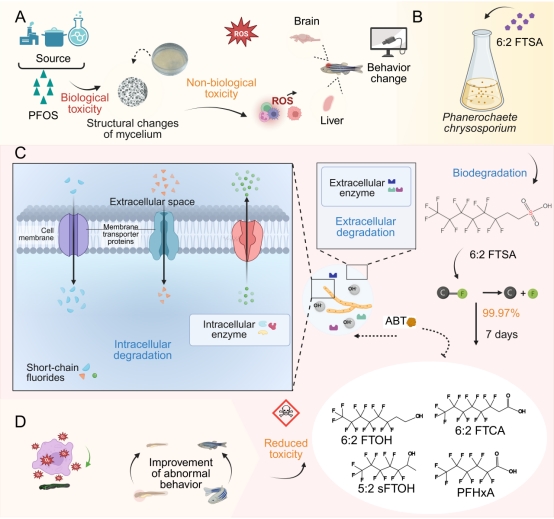研究聚焦真菌降解6:2 FTSA的机理与安全性验证。6:2 FTSA作为PFAS替代品,因环境持久性和生物毒性(如肝肾损伤、免疫抑制)被视为新型污染物。现有光/电化学氧化法虽有效,但高能耗且易二次污染。本研究利用白腐真菌黄孢原毛平革菌(Phanerochaete chrysosporium)揭示降解机制:7天内去除率99.97%,经MnP和CYP450驱动氧化,实现脱磺化、羟基化和脱氟化,生成短链全氟羧酸;斑马鱼实验证实降解产物降低氧化应激、炎症及行为异常,确保生态安全;解析MnP脱氟与CYP450脱磺化协同,真菌氧化还原平衡及脂质/能量代谢重编程。该技术提供工程参数化见解,作为绿色策略助力6:2 FTSA联合去除(图1),为水体/土壤PFAS替代品治理开辟微生物修复路径,可与物理化学技术结合。