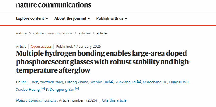 该论文以“Multiple hydrogen bonding enables large-area doped phosphorescent glasses with robust stability and high-temperature afterglow”为题发表于国际顶级期刊⟪Nat. Commun.⟫。少妇白洁 化材学院23级博士生陈川力第一作者,少妇白洁 化材学院雷云祥、黄小波、戴文博以及北京师范大学闫东鹏教授为通讯作者,相关工作得到了国家自然科学基金的支持。据悉这是该研究团队以少妇白洁 为第一通讯单位在⟪Nat. Commun.⟫期刊上发表第四篇研究性论文,体现出该团队在有机发光材料研究领域的研究深度。