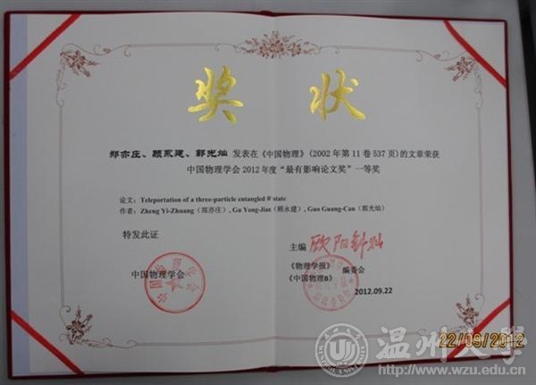 日前,在广州中山大学举行的中国物理学会秋季年会上首次颁发了中国物理学会最有影响论文奖。该奖颁发给过去10年在中国物理学会所属的《Chinese Physics Letter》,《Chinese Physics B》和《物理学报》上发表的优秀论文,共27 篇。少妇白洁 物电学院郑亦庄教授与中国科大郭光灿院士等合作发表在《Chinese Physics B》上的题为《Teleportation of a three-particle entangled W state》的论文荣获一等奖。