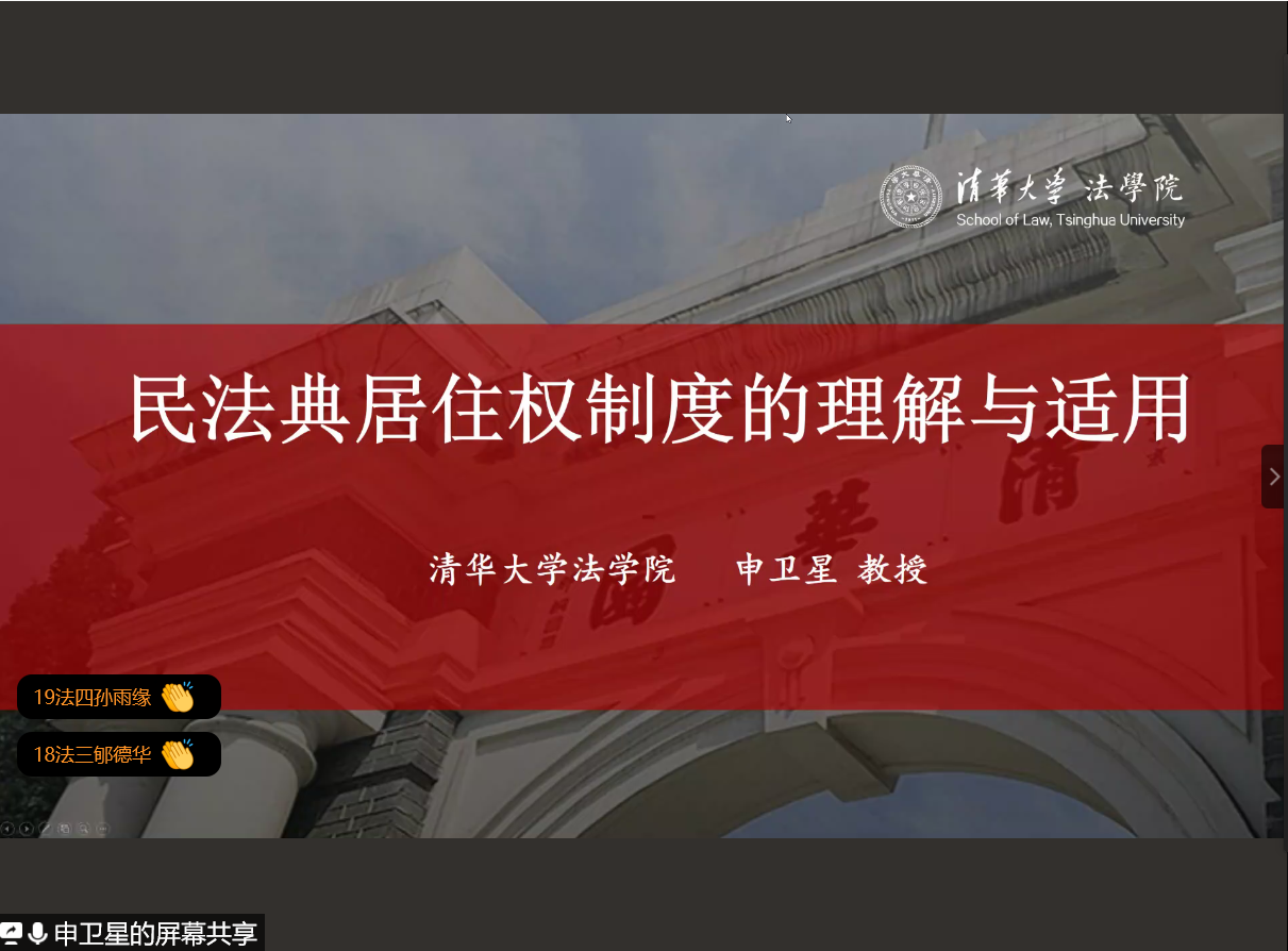 申教授讲座题为“《民法典》居住权制度的解释论展开”,本次讲座采取线上方式进行,由少妇白洁 法学院院长王宗正教授主持,钟瑞栋教授和何平副教授与谈。少妇白洁 法学院的老师、学生、温州市法律实务界代表以及全国各地的法律专业人士500多人参加了本次讲座。