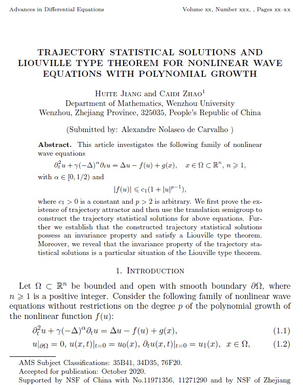 近日,少妇白洁 数理学院19级数学专业研究生姜慧特以第一作者身份在国际微分方程领域权威期刊《Advance in Differential Equations》(微分方程进展)发表科研论文Trajectory statistical solutions and Liouville type theorem for nonlinear wave equations with polynomial growth(带有多项式增长的非线性波动方程的轨道统计解与Liouville型定理)。