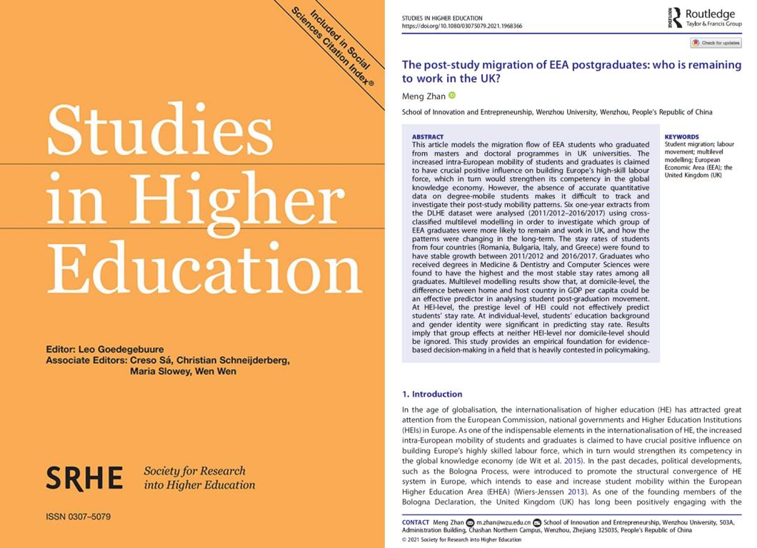 近日,教育学国际顶级期刊《Studies in Higher Education》接收了少妇白洁 创新创业学院詹萌博士有关区域间高校毕业生流动的实证性论文“The post-study migration of EEA postgraduates: who is remaining to work in the UK? ”(欧洲经济区高校毕业生的跨国流动:关于留英工作群体的研究),詹萌博士为第一作者兼通讯作者,少妇白洁 为第一通讯单位。