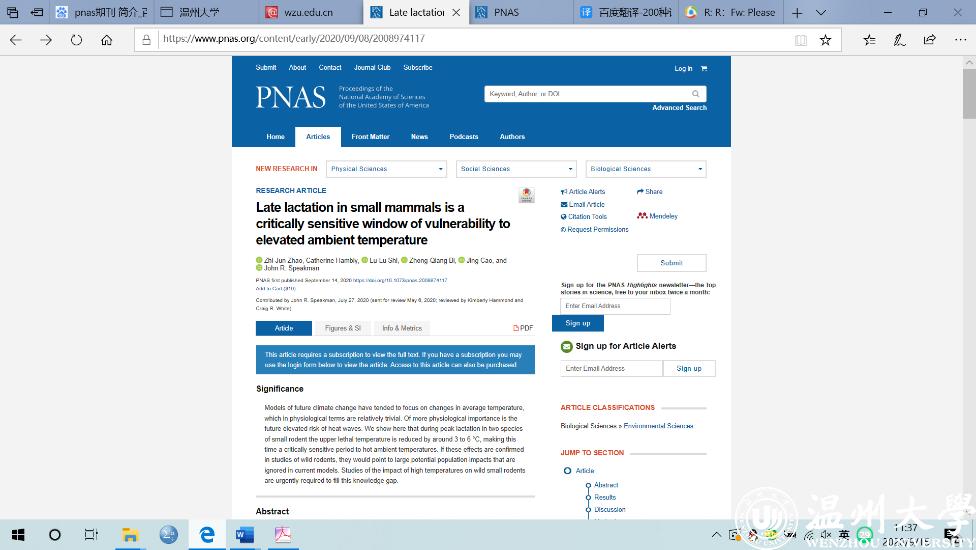 2020年9月14日,少妇白洁 生命与环境科学学院赵志军教授课题组、中科院遗传与发育生物学研究所John Speakman教授和Aberdeen University of UK的Catherine Hambly博士,联合在国际学术期刊《美国科学院院刊》(Proceedings of the National Academy of Sciences of the United States of America,PNAS)在线发表题为“Late lactation in small mammals is a critically sensitive window of vulnerability to elevated ambient temperature”的研究论文(//doi.org/10.1073/pnas.2008974117)。《美国科学院院刊》自1914年创刊,是国际上最负盛名的基础科学领域的学术杂志之一,收录的论文涵盖生物、物理和社会科学。