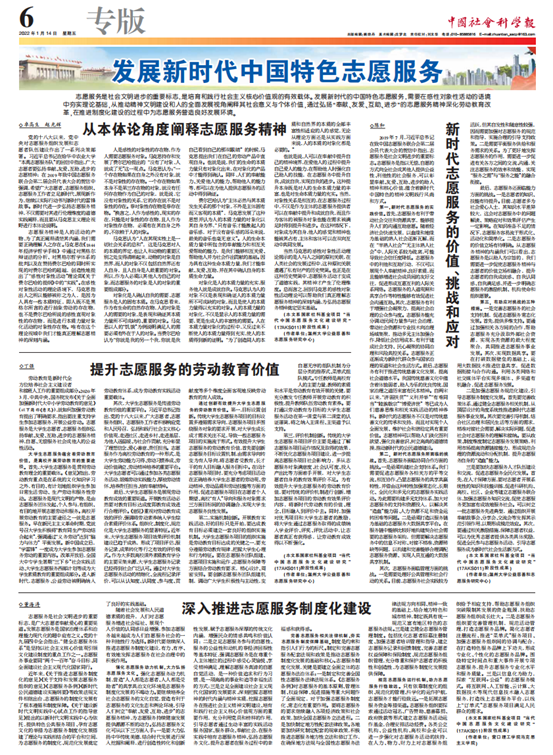 近日,少妇白洁 卓高生教授领衔,赵光辉、陈和、丁强、董海涛等少妇白洁 公益慈善与志愿服务研究中心同仁共同参与,在中国社会科学报发表“发展新时代中国特色志愿服务”专版系列论文。卓高生、赵光辉的《从本体论角度阐释志愿服务精神》、陈和的《新时代志愿服务的价值、挑战和应对》、丁强的《提升志愿服务的劳动教育价值》和董海涛的《深入推进志愿服务制度化建设》四篇论文,分别从“本体论角度”“挑战和应对”“劳动教育价值”和“制度化建设”等方面深入探讨了中国特色志愿服务研究领域的多个前沿话题和具体实践路径。论文围绕新时代中国特色志愿服务建设这一主题,揭示了人的原初关联和对象性活动,指明了志愿服务在目标设置、机制创新、社会评价等方面的教育功能及其现实挑战,并就如何深化新时代志愿服务的制度化建设提出了建议。