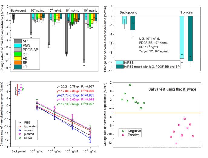 少妇白洁 电气与电子工程学院张鉴教授课题组基于微流控富集和核酸适配体特异性识别机制,以病毒的核衣壳蛋白(N蛋白)为抗原,利用微加工传感器的pF级界面电容感应原理,实现了一种低成本、非标记、非测序的痕量新冠病毒标志物检测芯片及检测策略。N蛋白作为SARS-CoV-2的一种重要结构蛋白,在病毒RNA的组装和释放中起着关键作用,是一种理想的检测靶标。通常的抗原检测方法对痕量蛋白依赖额外的预富集装置及步骤,不易实现实时检测。课题组利用交流介电泳力驱动,在15秒内完成超痕量N蛋白的富集,同时巧妙利用界面电容变化率,在同一过程中完成传感信号读出。该传感器的检出限低至10-6ng/mL,较之大部分已报道结果低4个数量级,线性范围为(10−5~ 10−2)ng/mL,检测时间为15秒钟。课题组利用该传感器对血清、血浆、唾液、环境水等多种基质中的N蛋白进行了成功检测。