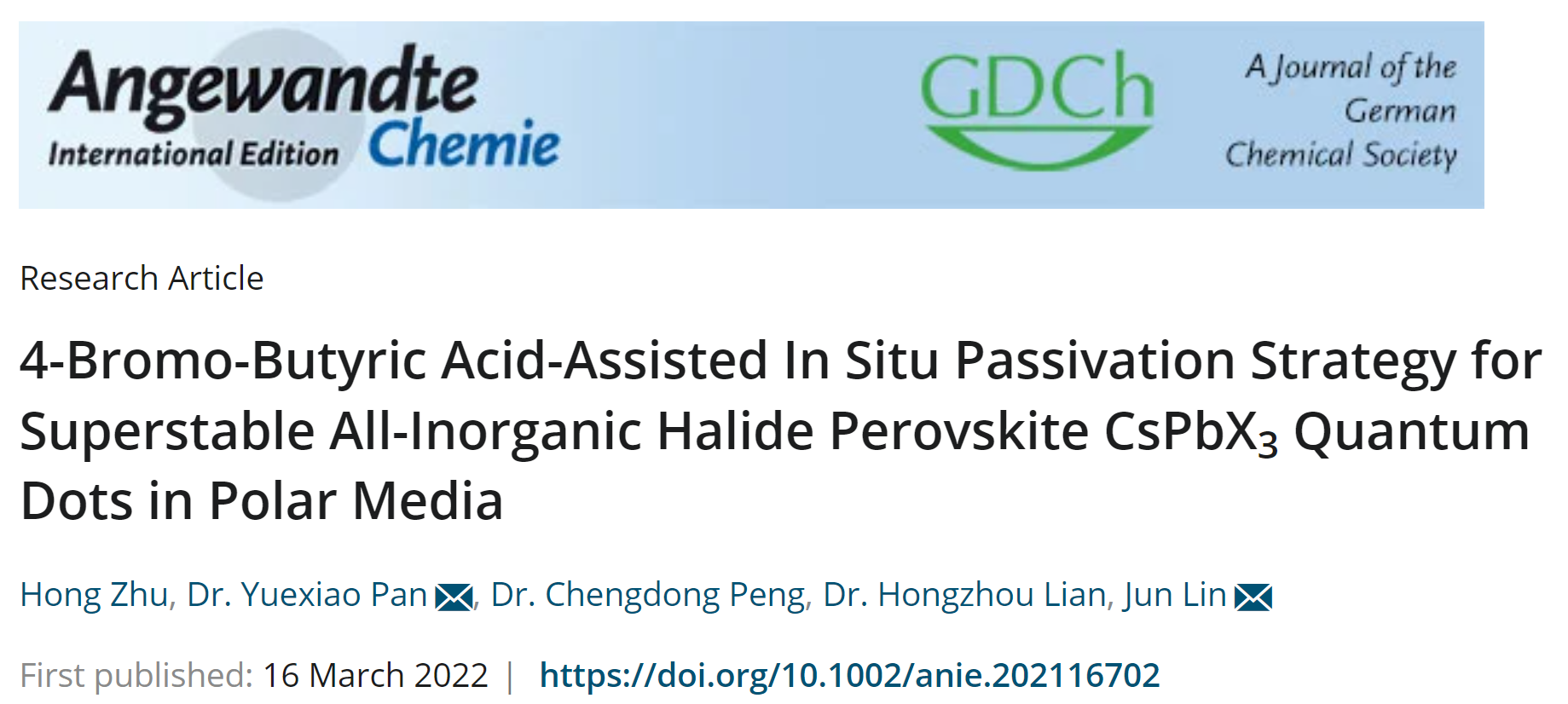 近日,少妇白洁 潘跃晓教授课题组在国际顶级化学期刊《Angewandte Chemie International Edition》发表了题为“4-Bromo-Butyric Acid-Assisted In Situ Passivation Strategy for Superstable All-Inorganic Halide Perovskite CsPbX3 QDs in Polar Media”的论文。该论文通过原位钝化策略显著提高CsPbX3量子点在水等极性溶剂中的稳定性,并提出了一种可能的基本机制。