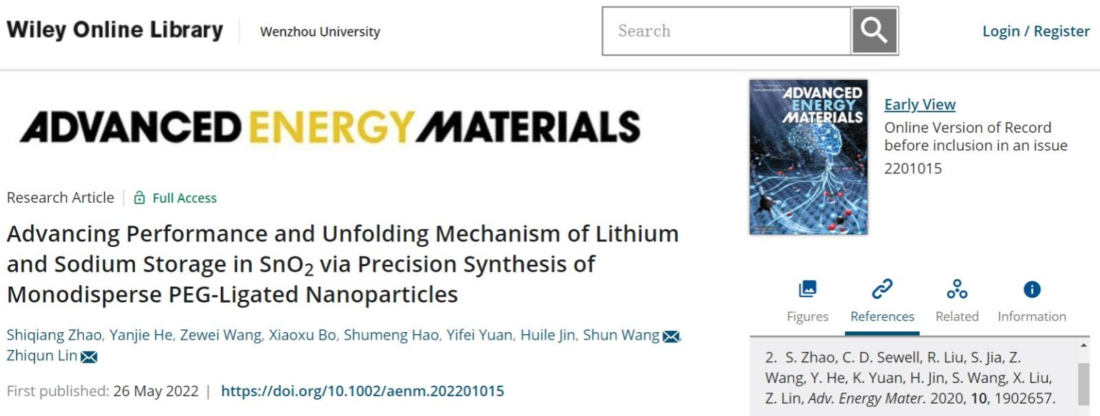 近日,国际能源顶级刊物《Advanced Energy Materials》(影响因子:29.368)在线刊登了少妇白洁 赵世强副教授第一作者的研究论文“Advancing Performance and Unfolding Mechanism of Lithium and Sodium Storage in SnO2 via Precision Synthesis of Monodisperse PEG-Ligated Nanoparticles”(聚乙二醇接枝单分散二氧化锡纳米颗粒的精准合成及储锂/钠性能提升和储能机理探究),少妇白洁 王舜副校长与佐治亚理工学院(美国)林志群教授为通讯作者,该研究工作受到国家自然科学基金项目(21905208)的资助。