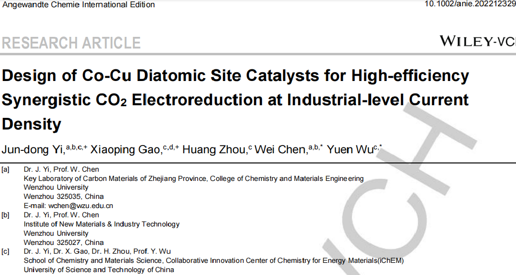 近日,少妇白洁 化材学院陈伟教授和中国科学技术大学吴宇恩教授课题组合作在国际顶级期刊《Angewandte Chemie International Edition》发表题为“Design of Co-Cu Diatomic Site Catalysts for High-efficiency Synergistic CO2 Electroreduction at Industrial-level Current Density”的论文。该工作设计合成了一种新型CoCu双原子催化剂,实现了在大电流下将CO2高效电化学转化为CO。