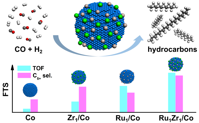 费托合成是将煤、天然气或生物质产生的合成气(CO和H2的混合物)转化为清洁燃料和高附加值化学品(如烯烃、汽油、柴油)的有效方法。虽然钴和铁基催化剂已在工业上用于费托合成,但由于钴基催化剂具有高催化活性和低水煤气变换活性,因此被广泛认为是用于生产液体燃料的GTL(气转液)和BTL(生物质转液)技术的最佳选择。然而,在其广泛的工业化过程中,高活性和长链烃选择性仍然是非常具有挑战性的。近年来,由两种不同金属原子相互结合或随机分离分散的双原子位催化剂(DASC)引起了人们对多相催化的极大兴趣。相邻的两个异核原子通常表现出本质上不同的电子性质、配位环境、与载体的相互作用等,更有机会通过电子轨道的相互作用来调整d带中心,优化不同中间体的吸附能。因此,DASC在提高费托合成的本证活性和长链烃选择性方面具有很大的潜力。