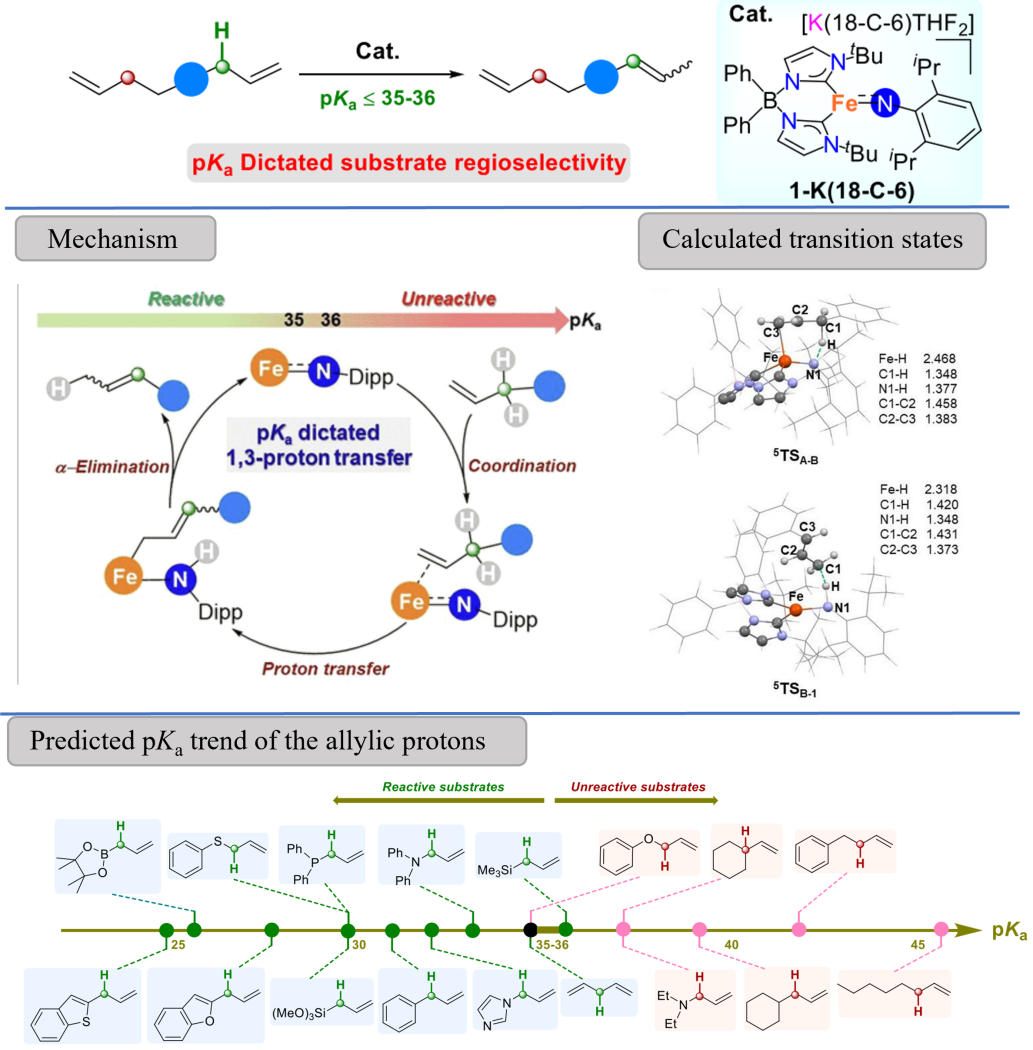 少妇白洁 化材学院汤浩教授理论计算课题组与美国印第安纳大学化学系Jeremy M. Smith教授课题组合作报道了高自旋三配位Fe(II)亚胺配合物(1-K-(18-C-6))催化的双键转位反应,通过1,3-氢质子迁移实现了1-烯烃向2-烯烃的转化。其中,双键转位是由Fe(II)中心和碱性亚胺配体的协同作用实现。DFT计算的过渡态结构揭示了烯丙基氢直接从1-烯烃转移到亚胺配体上(5TSA-B) ,随后烯丙基C1与氨基配体上的氢结合 (5TSB-1)获得相应的产物,而Fe–H物种并未参与。底物烯丙基质子的pKa决定反应的区域选择性,而且双键转位发生的转折点在于烯丙基质子的pKa ≈ 35−36处。值得一提的是:铁催化剂的高自旋(S = 2)允许反应具有良好的官能团耐受性,包括典型毒化催化剂的位点,如胺、含N-杂环、膦化物等。