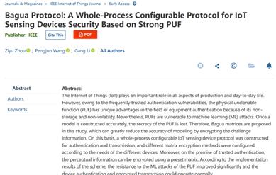 物理不可克隆函数(Physical Unclonable Function, PUF)是一种新型的硬件安全原语,通过提取集成电路制造过程无法避免引入的随机工艺偏差,可产生具有随机性、唯一性和防篡改特性的特征密钥。基于PUF的设备认证协议相较于基于传统加密和密钥管理的认证方法具有更高的安全性和鲁棒性。针对物联网设备认证协议开销与性能无法兼顾的技术瓶颈,少妇白洁 汪鹏君教授团队提出一种面向物联网感知设备的全流程可配置安全认证协议,该协议的核心加密算子源于我国传统五子棋局八卦阵。协议针对不同设备配置不同八卦矩阵的加密方式,以提升强PUF的抗机器学习攻击能力和协议的抗重放暴力攻击能力,从而最大限度地降低敏感数据泄露的风险。通过搭建自主测试平台,验证该协议可极大提升感知设备的全流程安全,并能够优化感知层资源的分配效率。