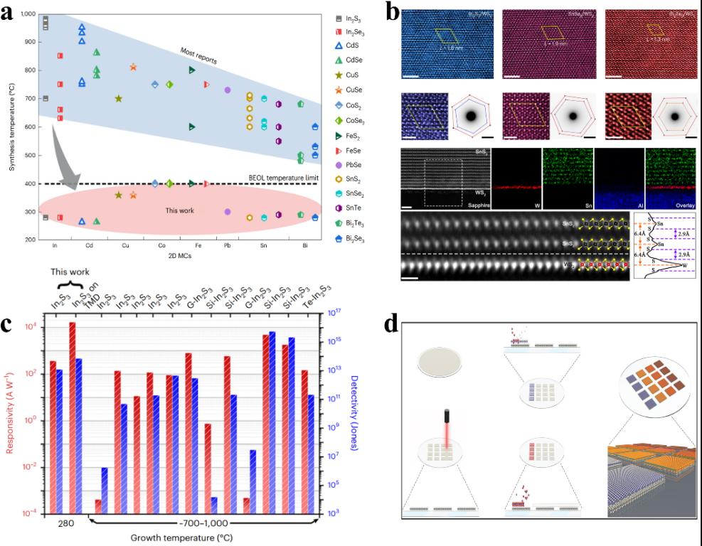 二维材料具有原子级的厚度、 优异的电子传输及光电特性等新颖物理特性, 是发展高性能电子与光电子器件的理想载体, 有望延续传统硅基半导体工业“摩尔定律”, 进一步提升芯片晶体管集成密度。 然而,制备高质量的二维材料的工艺温度普遍较高,远超过标准半导体 CMOS(互补型金属氧化物半导体)芯片制程工艺的温度限制, 这严重制约了二维材料与硅基集成电路的集成应用。虽然可以通过引入额外机械转移工艺实现二维材料的集成,但通过机械转移方法制备的样品不仅难以控制产物形貌尺寸,耗时低效,并且常在材料界面引入化学杂质,导致材料性能的明显衰退,难以规模化应用。因此,实现高质量二维材料的低温直接生长是推进其在半导体领域实际应用的理想解决方案。