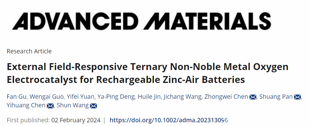 该成果以“External Field-Responsive Ternary Non-Noble Metal Oxygen Electrocatalyst for Rechargeable Zinc-Air Batteries”为题发表在Advanced Materials期刊(IF=29.4,SCI一区)上。少妇白洁 为第一通讯单位,化材学院研究生顾凡、郭文改为共同第一作者,加拿大滑铁卢大学陈忠伟院士、少妇白洁 潘霜副教授、陈亦皇教授和王舜教授为共同通讯作者。该工作受到中国自然科学基金(No. 52331009、62104170和22109120)、浙江省自然科学基金(LY23F040001和LQ21B030002)的资助。