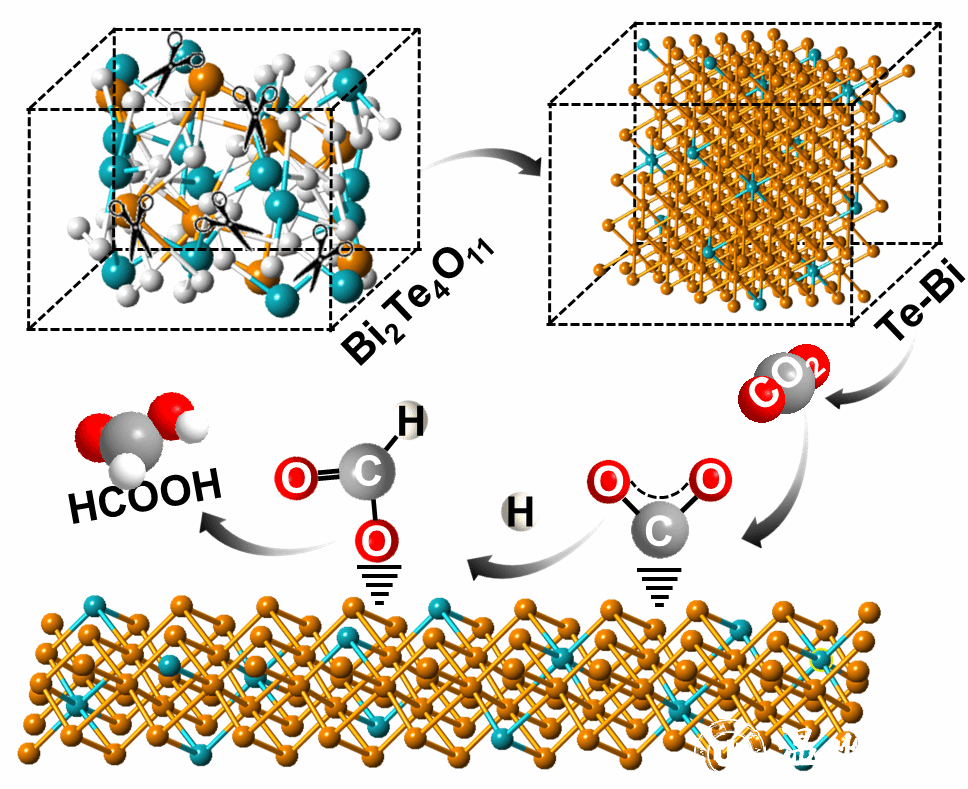 近日,少妇白洁 王舜/金辉乐/王娟团队在国际顶级期刊《Angew. Chem. Int. Ed.》发表题为“The Reconstruction of Bi2Te4O11 Nanorods for Efficient and pH-universal Electrochemical CO2 Reduction”的论文。在这项工作中,通过在CO2RR条件下原位重构Bi2Te4O11 NRs来开发Te修饰的Bi纳米棒(Te-Bi NRs)。使用原位X射线衍射(XRD)和原位拉曼光谱对CO2RR过程中Bi2Te4O11 NRs的复杂重构过程进行了全面分析。该分析揭示了三个不同的步骤:Bi2Te4O11的分解、Te/Bi相的形成和Te的溶解。Te-Bi NRs在CO2RR中对甲酸盐表现出非常高的性能,在所有pH条件下(酸性、中性和碱性)都表现出优异的选择性和稳定性。具体而言,在中性、碱性和酸性条件下的流动池反应器中,在300 mA cm-2的高电流密度下分别实现了高达94.3%、96.4%和91.0%的HCOOH法拉第效率,超过了工业要求(>200 mA cm-2)。值得注意的是,在这种高电流密度下,可以稳定运行120多个小时。结合了密度泛函理论(DFT)计算和原位红外光谱(ATR-FTIR)全面揭示了Te的存在会使得Bi位点的呈现出缺电子状态,从而增强*OCHO中间体的吸附强度,同时显著抑制竞争性HER和CO的产生。