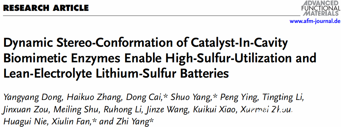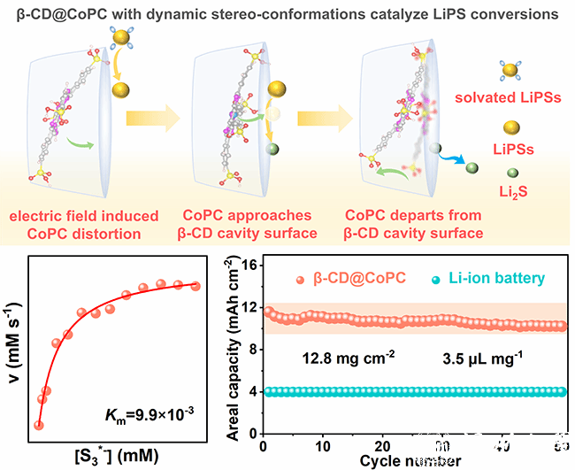 近日,少妇白洁 杨植教授团队联合浙江大学的范修林教授,在国际知名期刊Advanced Function Materials上发表题为“Dynamic stereo-conformation of catalyst-in-cavity biomimetic enzymes enable high-sulfur-utilization and lean-electrolyte lithium-sulfur batteries”的文章。该工作,受启发于天然酶结构中各组分的协同作用,巧妙将磺化钴酞菁(CoPC)催化中心植入β-环糊精(β-CD)腔中,在硫正极中高精度地构筑了仿生酶催化剂(β-CD@CoPC)。这种多功能的β-CD@CoPC催化剂显著提高了贫电解质锂硫电池的硫氧化还原活性,同时加速了放电产物Li2S在催化剂表面的解离。结果表明,具有β-CD@CoP仿生催化剂的Li−S软包电池实现了优异的电化学性能。通过多种半原位/原位实验手段系统地确定了电化学性能改进的根源。更重要的是,通过拟合米氏方程确定了米凯利斯常数(Km)是锂硫电池仿生酶催化活性的关键描述符,有助于快速、高效地筛选Li-S电池催化剂。