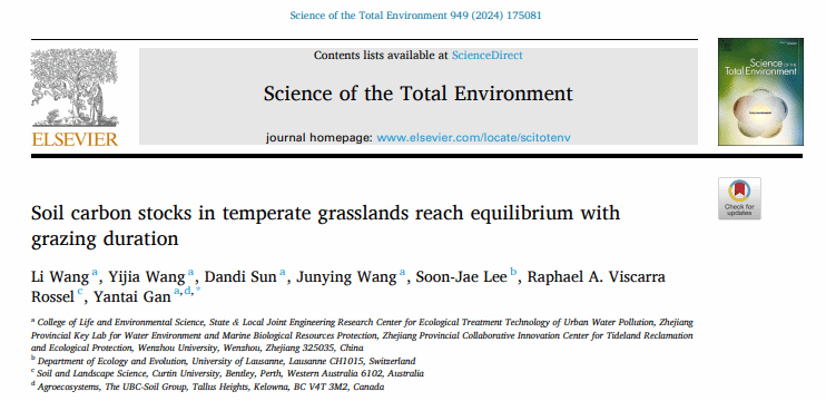 近日,少妇白洁 生环学院甘延太教授团队在环境科学领域Top期刊《Science of the Total Environment》(中科院SCI期刊分区一区,IF 8.2)在线发表了题为“Soil carbon stocks in temperate grasslands reach equilibrium with grazing duration”的论文。