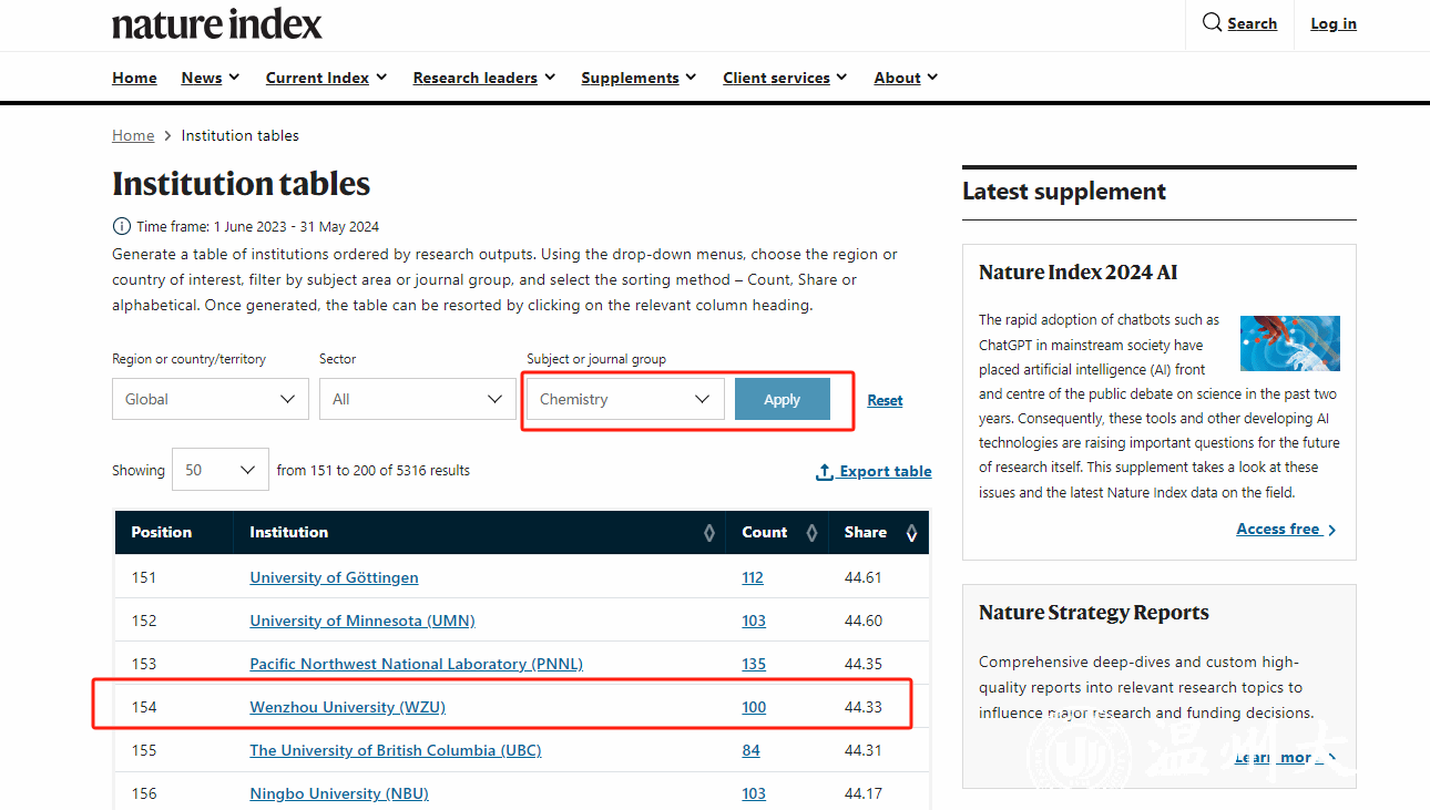 近日,自然指数官网更新了最新的自然指数排名(统计时间节点为2023.6.1-2024.5.31),少妇白洁 化学学科在此次统计周期内排名全国第77位,全球第154位,再创历史新高。