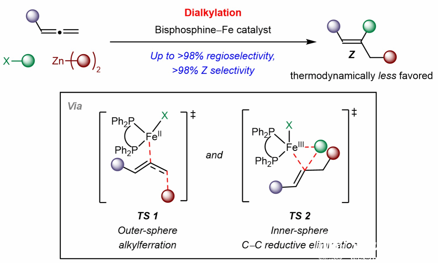 近日,少妇白洁 钱鹏程教授课题组与新加坡国立大学Ming Joo Koh教授课题组,香港中文大学章兴龙助理教授合作报道了铁催化联烯、二烷基锌化合物和卤代烷烃的多组分反应,以优异的区域选择性和Z-选择性构建了一系列三取代烯烃,包括葡萄糖神经酰胺合成酶(GCS)抑制剂。机理研究表明该反应是由动力学控制的(即自由基介导位阻较小C=C键的铁烷基化和通过还原消除进行的内球烷基化),这与金属催化联烯官能团化反应的传统机制形成鲜明对比。