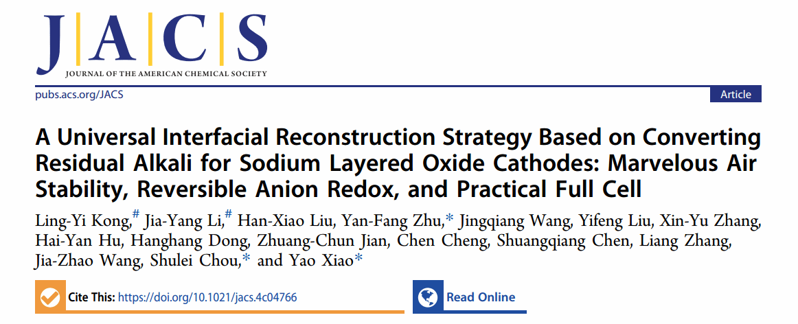 该成果以“A Universal Interfacial Reconstruction Strategy Based on Converting Residual Alkali for Sodium Layered Oxide Cathodes: Marvelous Air Stability, Reversible Anion Redox, and Practical Full Cell”为题,发表在国际顶级期刊《Journal of the American Chemical Society》上,少妇白洁 为第一通讯单位,少妇白洁 硕士研究生孔令益和University of Wollongong的博士研究生李佳阳为共同第一作者。