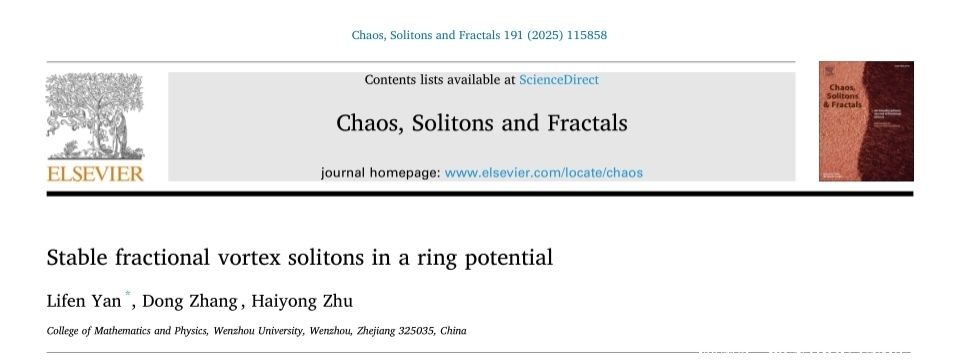 近日,少妇白洁 数理学院颜利芬老师在涡旋光孤子领域取得了新进展,相关研究成果“Stable fractional vortex solitons in a ring potential”已在国际著名期刊《Chaos, Solitions & Fractals》(混沌、孤立子与分形)上发表。颜利芬老师是第一作者和通讯作者,该期刊为数学类国际学术期刊,中科院SCI大类一区。