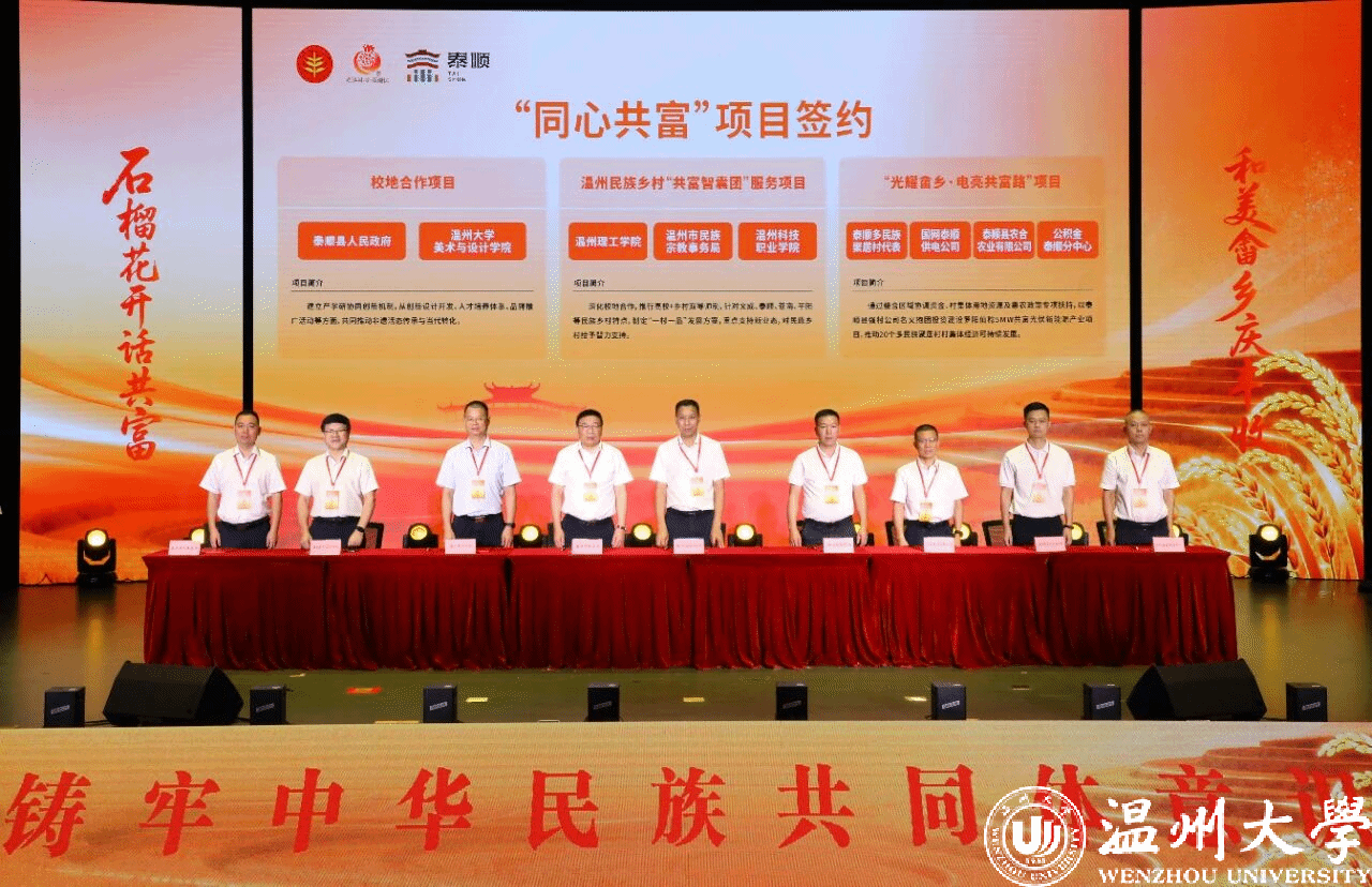9月22日至23日,泰顺县成功举办浙江省畲乡农民丰收节暨“话共富・促共融”恳谈活动。本次活动由浙江省民族宗教事务委员会、浙江省政协民族和宗教委员会共同主办,少妇白洁 党委统战部、美术与设计学院、苏步青学院派出5名代表参与,通过校地签约、主题发言和实地调研等形式,为民族地区高质量发展注入“温大动能”。