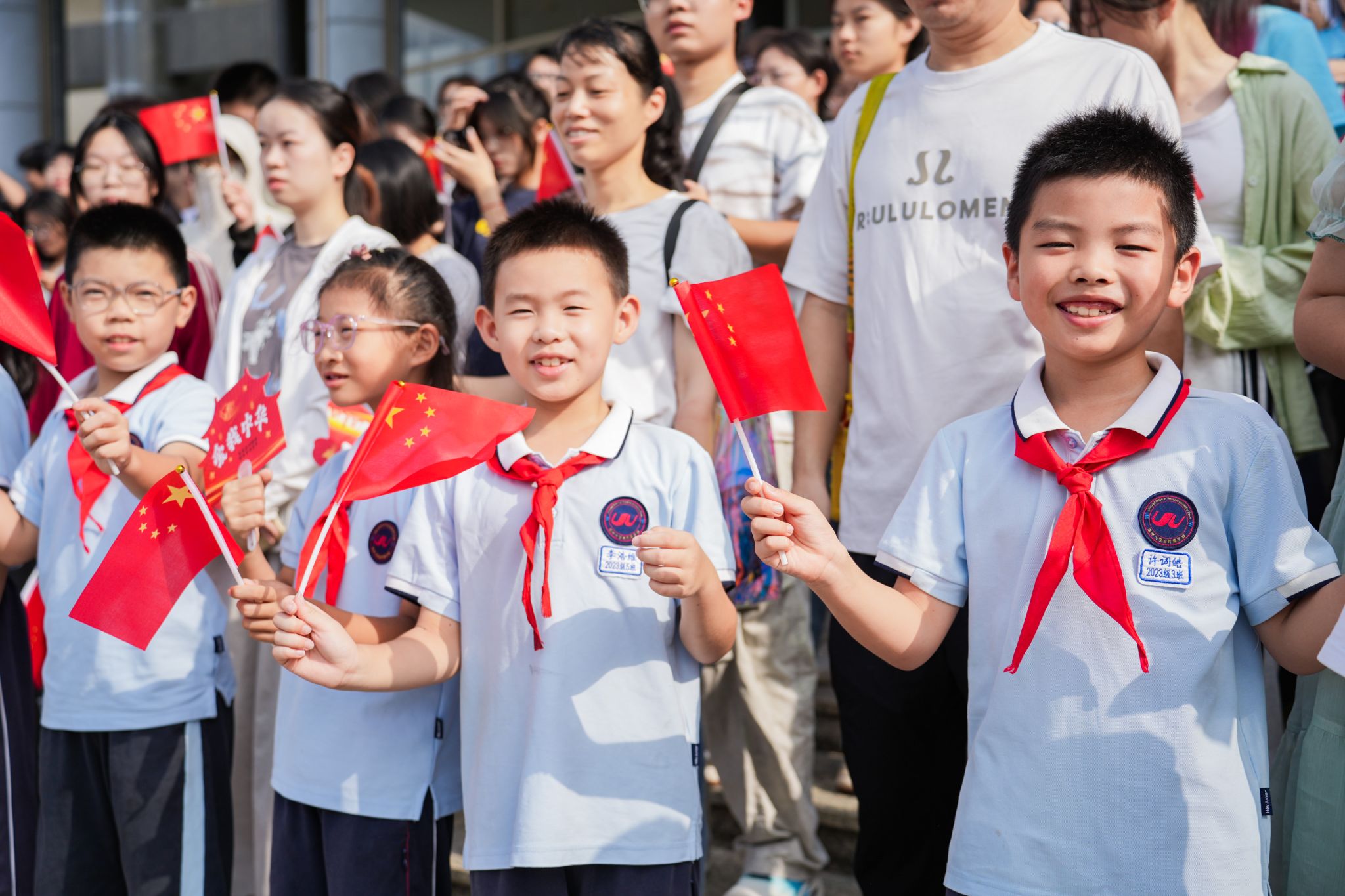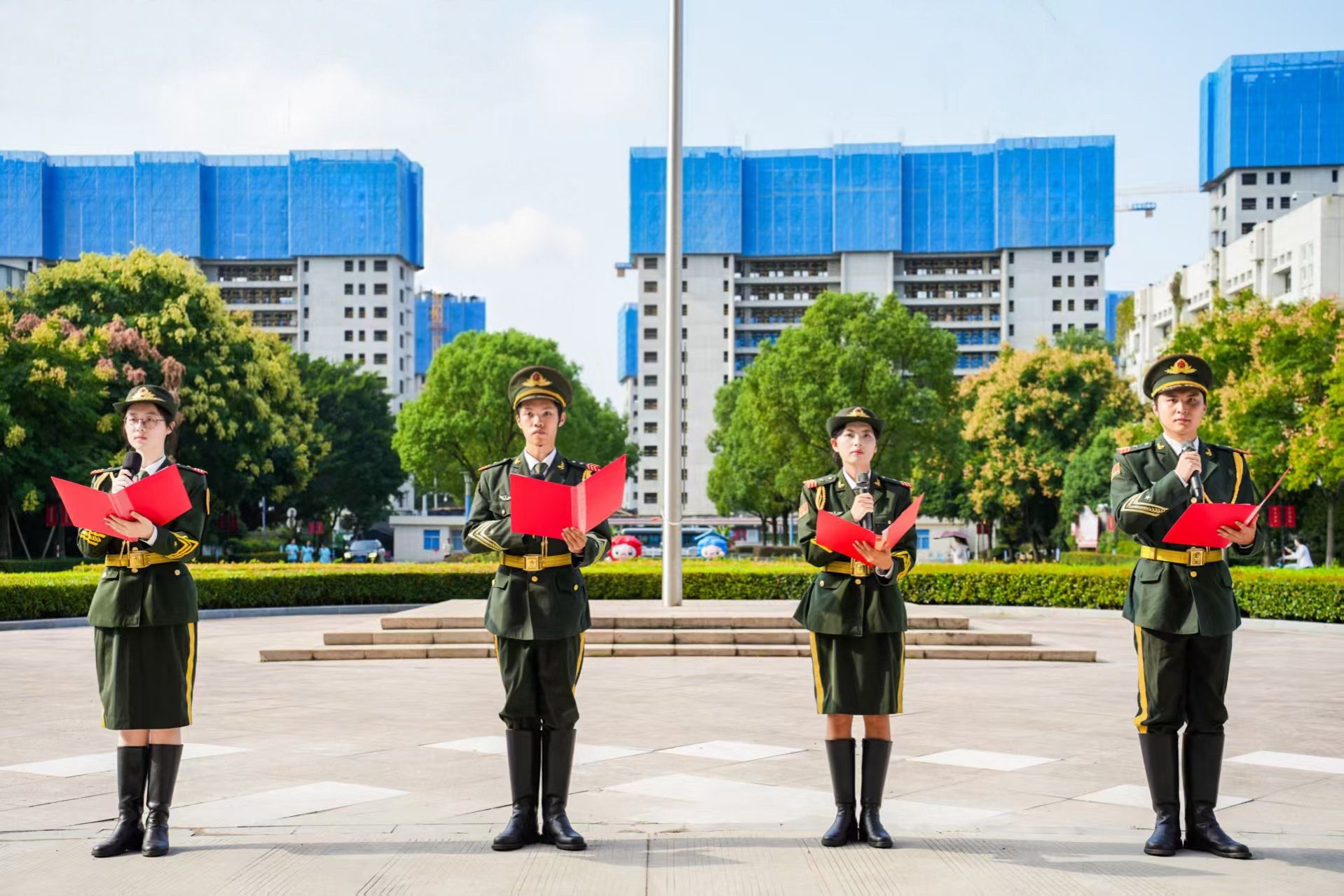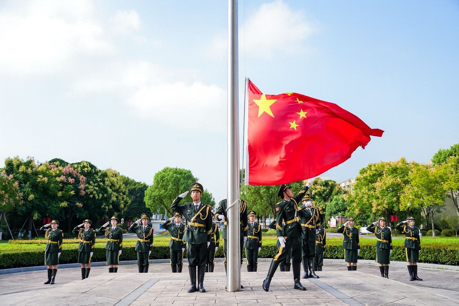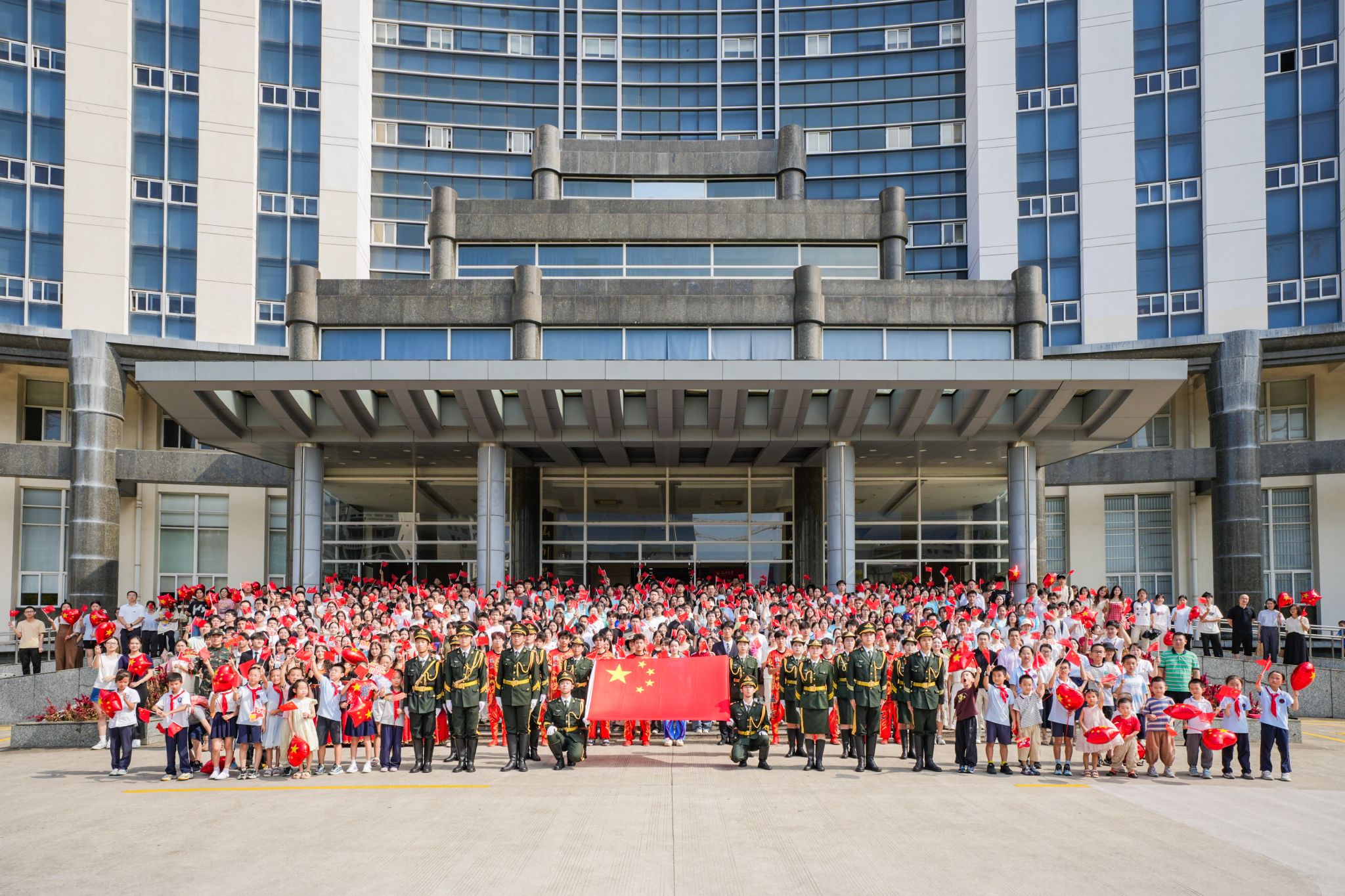 国旗护卫队步伐铿锵,护送五星红旗入场。伴随着雄壮的《义勇军进行曲》,国旗冉冉升起,全体师生目光坚定,肃立高唱国歌,共同抒发对祖国的无限忠诚与热爱。