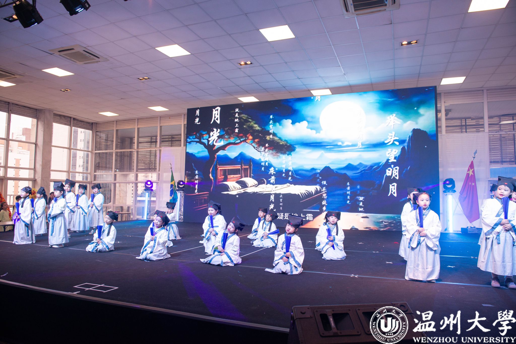 音乐学院李恒子老师指导的群舞《一条大河》在激昂而柔情的旋律中展开。孩子们用灵动的身姿,深情的演绎诉说着对祖(籍)国的眷恋。