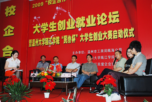论坛上,温州市高教园区管委会副主任、瓯江学院首席创业指导师黄培垃,瓯江学院党委副书记张敏,温州罗格朗电器有限公司常务副总经理崔昆,浙江恒丰泰减速机制造有限公司董事长叶胜康,浙江焦点烟具有限公司董事长兼总经理潘武,学生自主创业代表陈琼、黄高健等和广大大学生,共同探讨在金融危机的大背景下,大学生进行创业就业需要具备什么样的素质和能力,学校、企业应提供什么样的帮助,怎样更好地认识当前经济形势中所蕴含的机遇等问题。