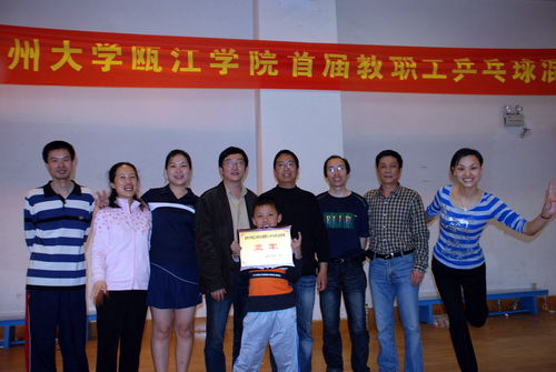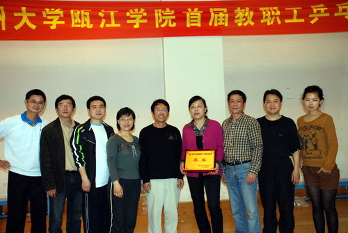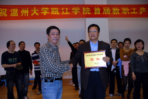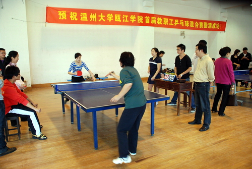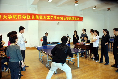 4月11日,瓯江学院首届教职工乒乓球混合团体赛在学院路校区体育馆二楼乒乓球馆举行,经过一天的激烈角逐,商务系、理学系、文学系分列冠亚季军。