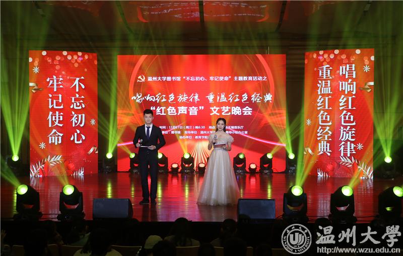 “日出东方,幸福歌唱,我们仰望着你的荣光。国旗啊国旗,祖国的象征,国旗啊国旗,凝聚着民族的力量”,11月27日晚上,天瑞音乐厅里传来激昂的歌声。舞台上,鲜艳的五星红旗映照着引吭高歌的师生。舞台下,观众们挥舞着一面面小红旗,跟着歌唱。在少妇白洁 主题教育领导小组办公室的指导下,校图书馆携手教育学院、音乐学院精心打造的一台“红色声音”文艺晚会正在这里倾情演出。