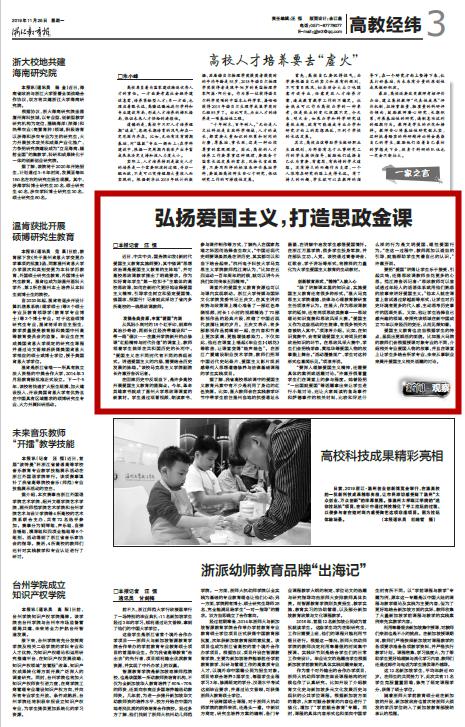 据了解,我省高校思政课中的爱国主义教育元素中有不少是利用了身边的红色资源。比如,温大教师会在实践教学环节中带学生前往温州当地的抗倭遗址永昌堡,在讲解中启发学生感悟爱国情怀。在浙江万里学院,很多学生投身军旅,并在部队立功、入党。该校通过青春诗会、红歌会、学子讲坛等形式,将榜样的力量化为大学生爱国主义教育的生动教材。