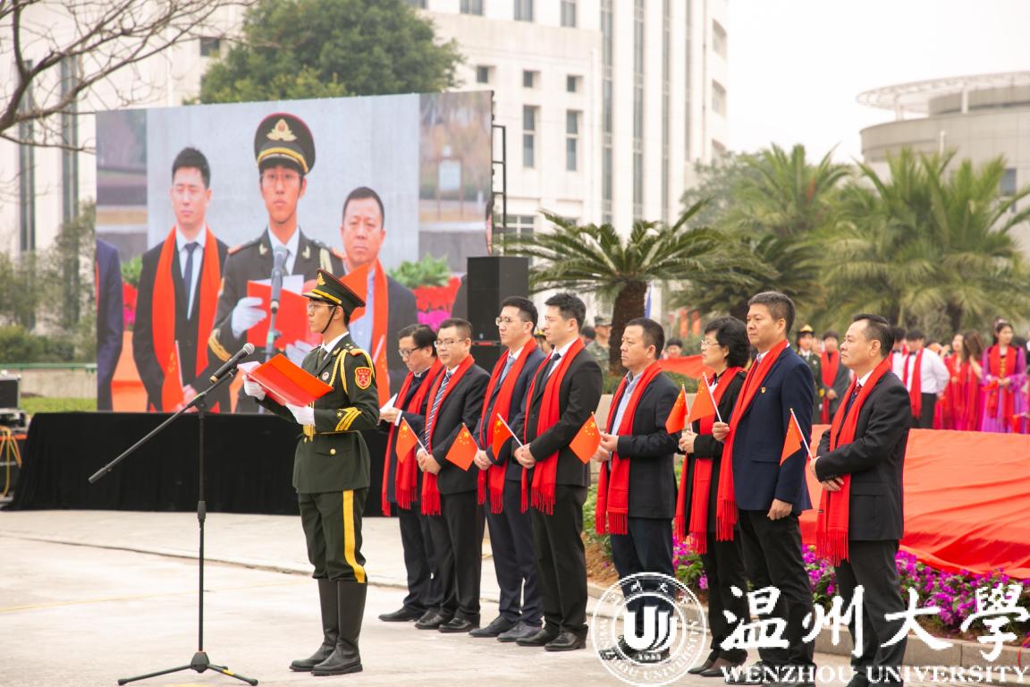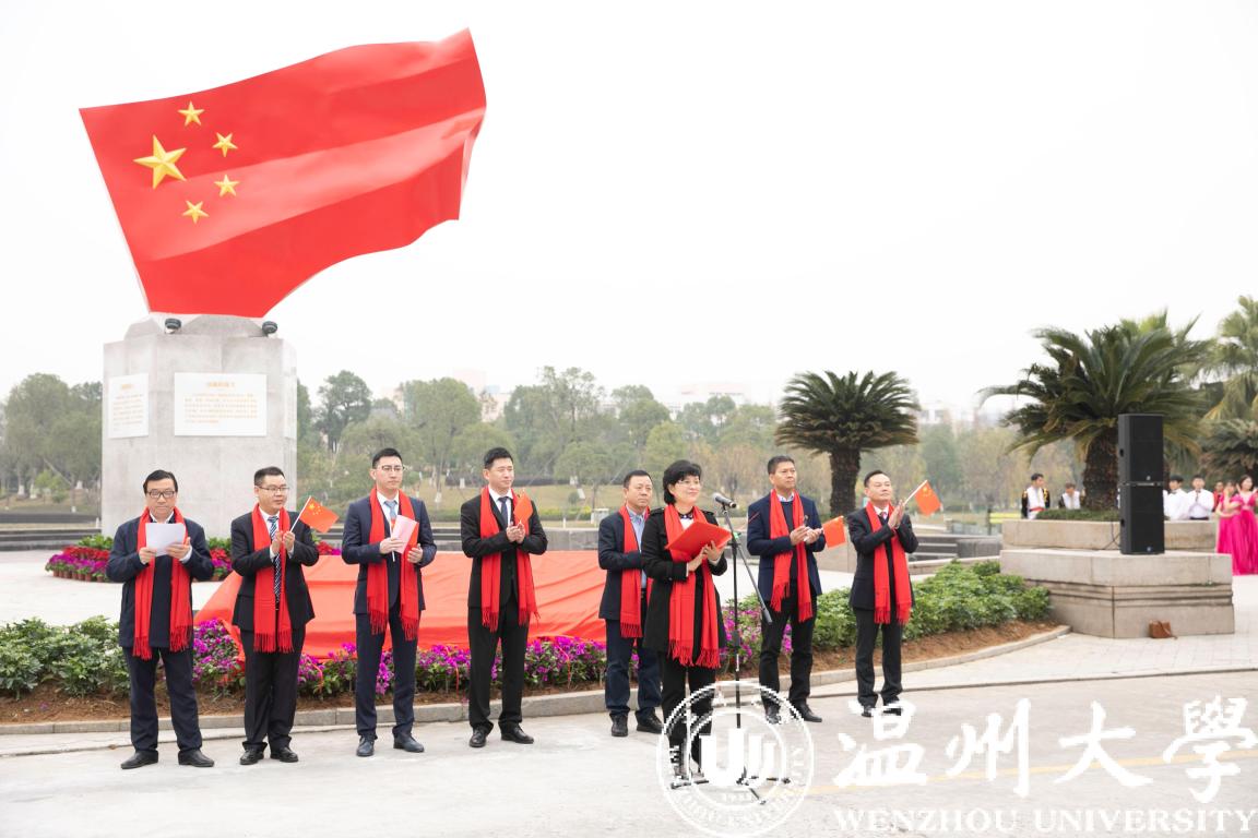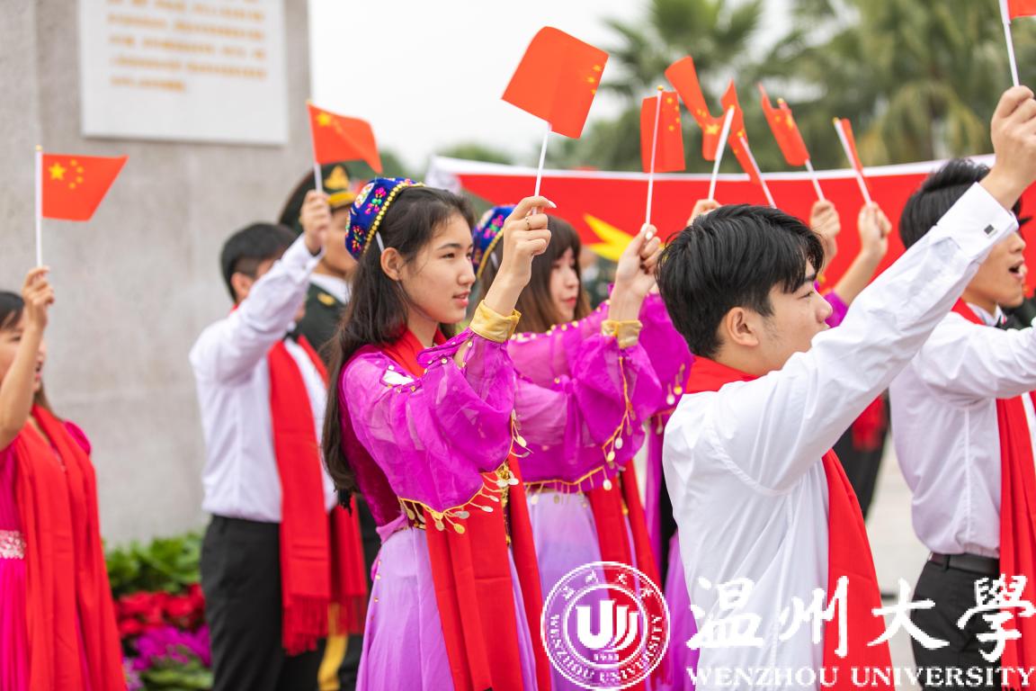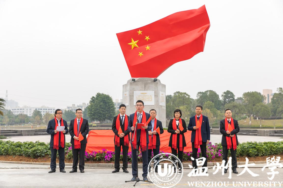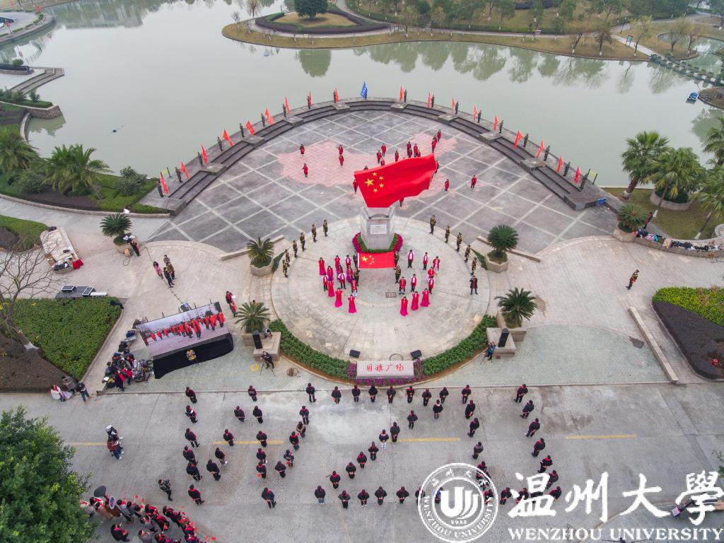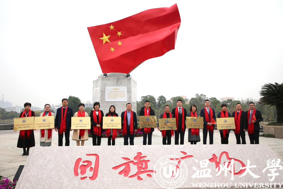 国旗广场落成揭牌在庄严的升国旗仪式中开始,校国旗护卫队队员英姿飒爽、步列整齐,五星红旗伴随着雄壮的国歌声高高升起并飘扬在温大校园上空,在场嘉宾、师生行庄严的注目礼。