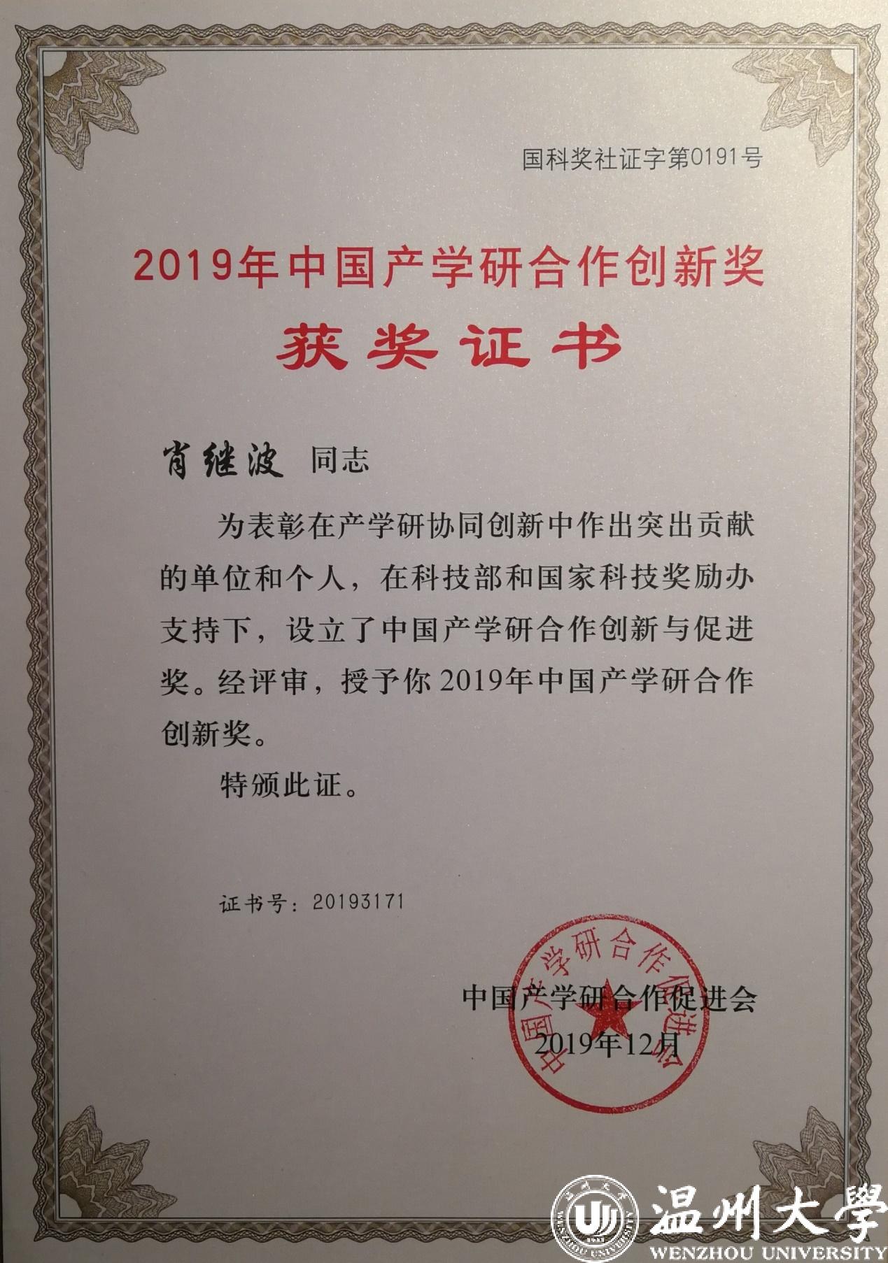 肖继波教授获得的中国产学研合作创新奖(个人)证书
