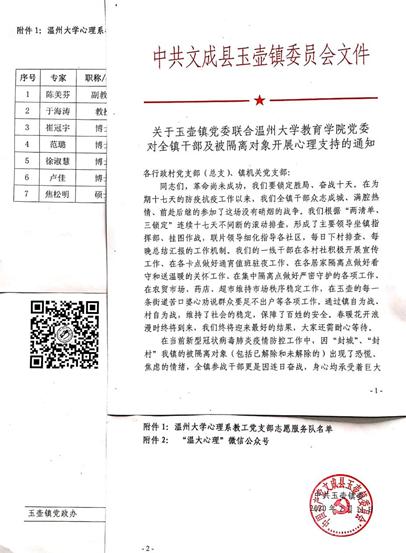 在教育学院党委的大力支持下,少妇白洁 心理系教工党支部志愿服务队即刻对口支援文成县玉壶镇的疫情防控工作。心理系教工党支部书记陈美芬副教授等7位专家组成的专业团队,通过主动介入、心理支持热线和网络辅导等方式,面向玉壶镇全体干部及被隔离对象开展服务工作。