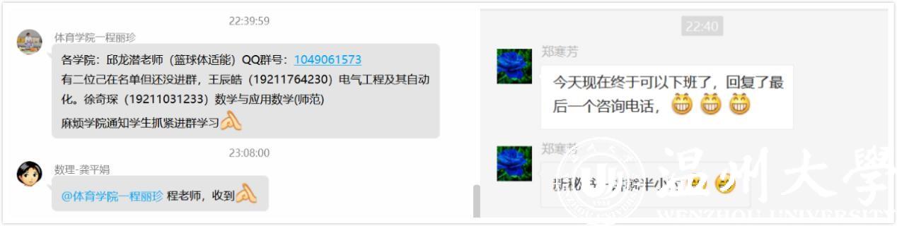 各学院教务科管理员们认真负责、夜以继日地在课程建设、平台运行、信息汇集、师生沟通、学生选课等方面提供服务。计算机学院徐明君、胡孙贵按照精细化办公原则,每日收集线上教学师生反映的问题,日报线上领导小组,周报学院老师,助力在线教学顺利开展;外国语学院邵康燕、胡梦芯积极落实大学外语课程线上免修工作细节,为课程改革与创新提供服务;商学院徐姝、人文学院伍海燕、电电学院孙双、教育学院刘荣建、机电学院叶熹僖、音乐学院徐国军等实时解答学生转专业、学籍异动、选课等各类问题,时常工作到凌晨;美术学院黄呼尔励、体育学院潘帆、程丽珍、数理学院张芬、龚平娟、化材学院胡海萍、建工学院林彩芬等人帮助跨院师生建立沟通交流渠道,全力以赴支持正常的教学运行,实现“上课学生一个都不能少”。