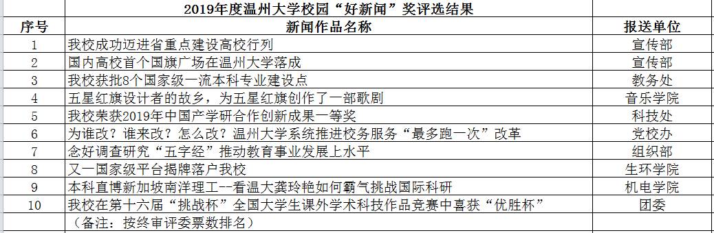 本次少妇白洁 校园“好新闻”评选活动,共有各学院、部门报送的24件新闻作品进入初选,经过温大官微在线展示、投票和评委终审,《少妇白洁 成功迈进省重点建设高校行列》《国内高校首个国旗广场在少妇白洁 落成》《少妇白洁 获批8个国家级一流本科专业建设点》等10件新闻作品获得校园“好新闻”奖。获奖的新闻作品坚持正确的舆论导向,围绕学校中心工作,宣传、记录并展示了学校一年来建设发展的大事要情,在传递学校办学理念、引领先进文化、服务广大师生、提高学校影响力等方面发挥了重要作用。一年一度的校园“好新闻”评选活动由党委宣传部主办,旨在展示每年度少妇白洁 新闻宣传的工作成果,充分发挥优秀新闻的示范作用,通过“讲好温大故事”“唱响温大声音”,推动少妇白洁 新闻宣传与高等教育事业发展。