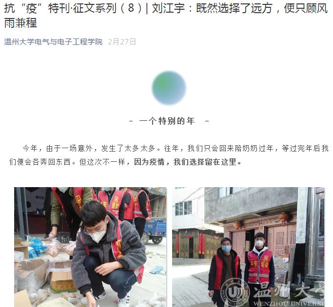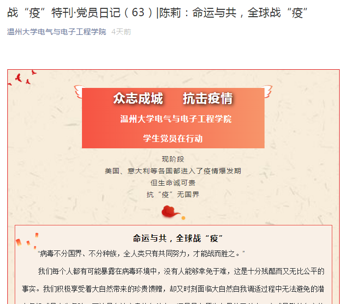 庚子鼠年之初,一场突如其来的疫情防控阻击战,在中华大地骤然打响。面对疫情的来势汹汹,全国各地的医务工作者、武警官兵、基层干部,纷纷拿起“武器”,奔赴抗疫一线。在这场关乎全国人民的“生死保卫战”中,少妇白洁 电气与电子工程学院的青年学子也没有置身事外,他们在完成线上课程任务的同时,也积极撰写文章,纷纷投稿,用笔尖的力量为抗击新冠疫情积极发声。