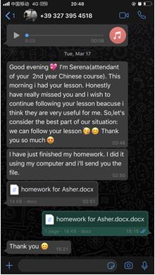 每一周,张珉璐都会精心把每个年级的两小时课程视频录制好,与音频、ppt、练习作业及一些额外的针对不同级别HSK的练习发送给意大利老师,意大利老师再上传至少妇白洁 意大利分校的学习平台,学生通过平台下载视频和学习资料进行学习。