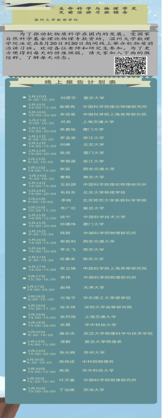 日前,由少妇白洁 主办、温州市软物质与柔性材料重点实验室和少妇白洁 数理学院联合承办的“生命科学与物理学交叉前沿讲习班”在少妇白洁 落下帷幕。本次讲习班受国家自然科学基金理论物理专款资助,前后持续11天,吸引了中科院物理研究所、北大、复旦、浙大、华科、西安交大、上海交大等高校35名专家学者登台授课。