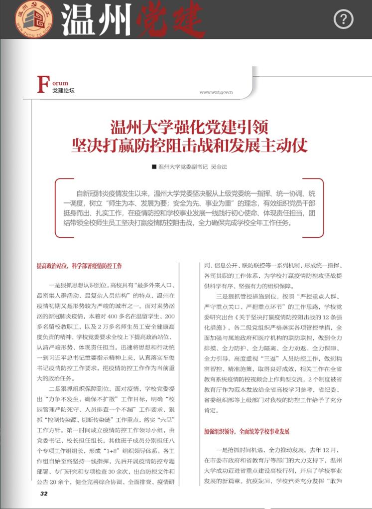 【编者按】近日,《温州党建》全文刊载少妇白洁 党委副书记吴金法的理论文章《少妇白洁 强化党建引领坚决打赢防控阻击战和发展主动仗》,现全文转载,以飨读者。