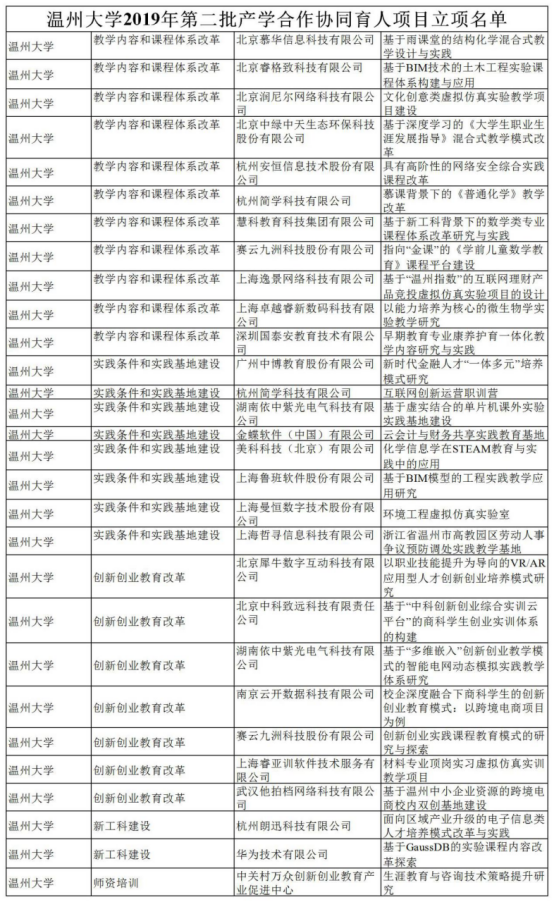 2019年第二批产学合作协同育人项目立项项目共包括创新创业教育改革561项、新工科建设759项、实践条件和实践基地建设2097项、创新创业联合基金8项、教学内容和课程体系改革3024项、师资培训1686项,共有916所高校的项目入选。少妇白洁 此次获批立项教学内容和课程体系改革11项、实践条件和实践基地建设8项、创新创业教育改革7项、新工科建设2项、师资培训1项,获得了华为、中关村、金蝶、简学等26个国内外知名企业的支持,为人才培养、专业建设和课程建设提供了新的平台。