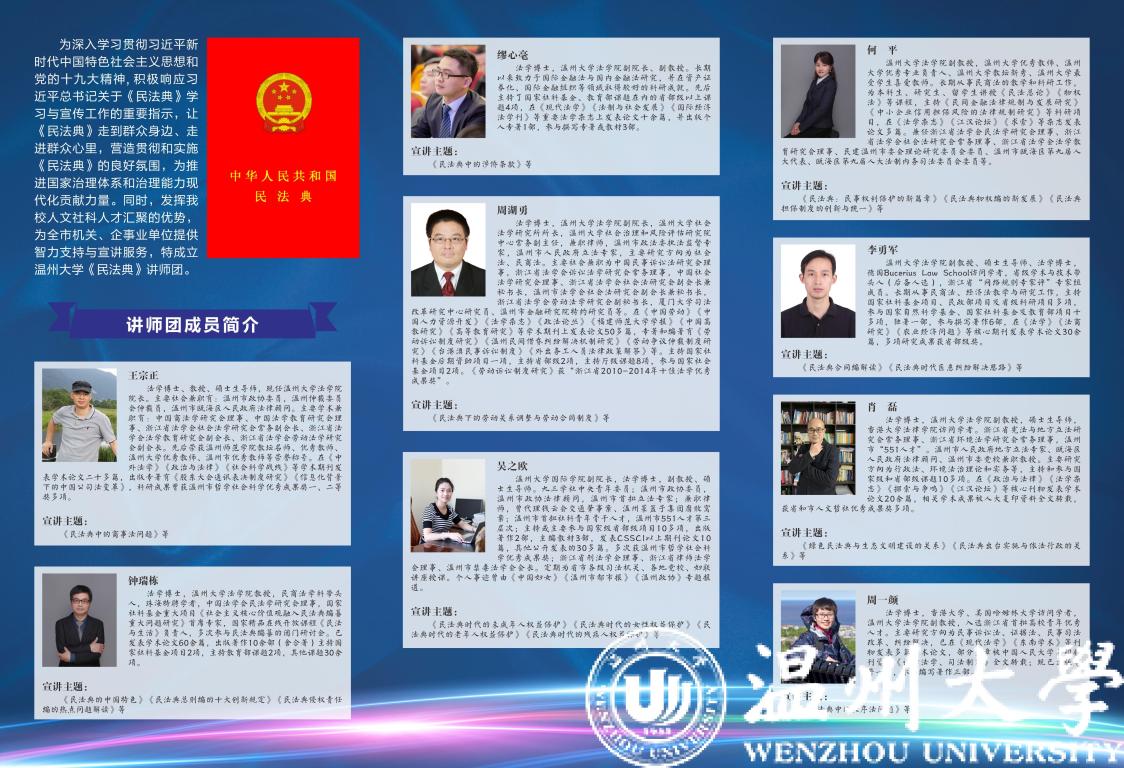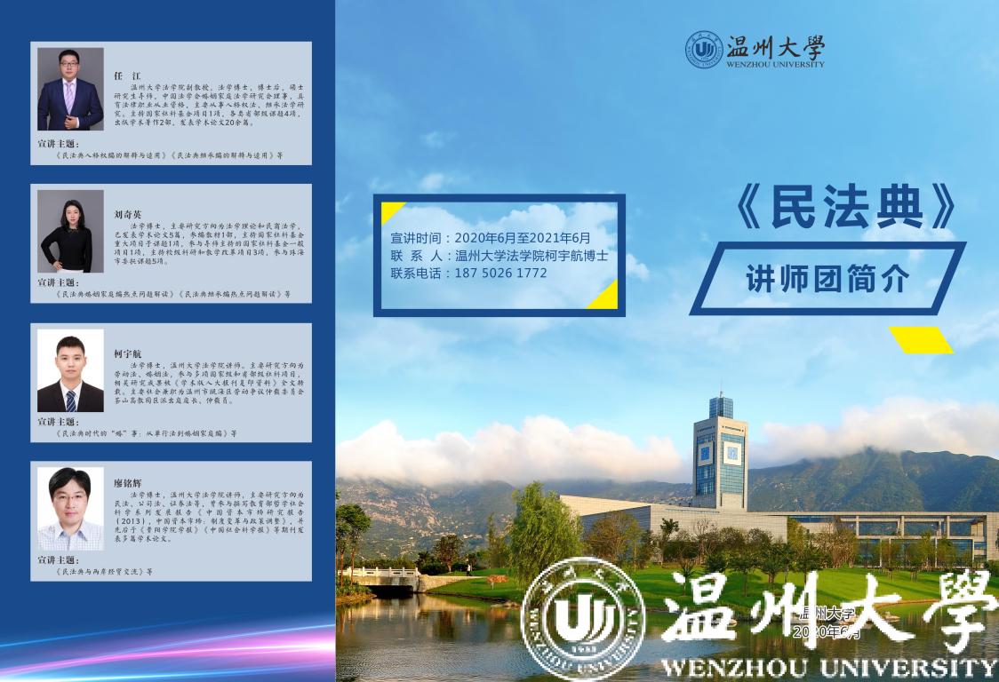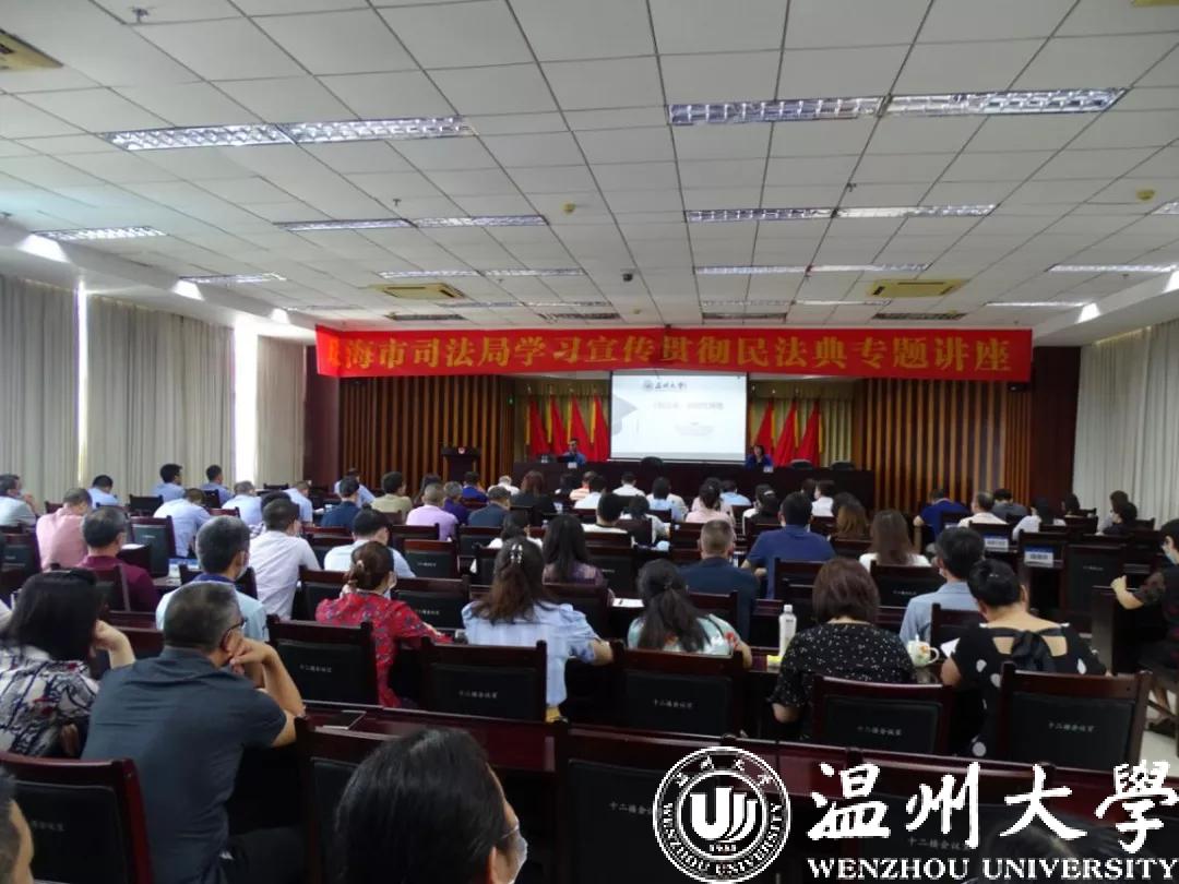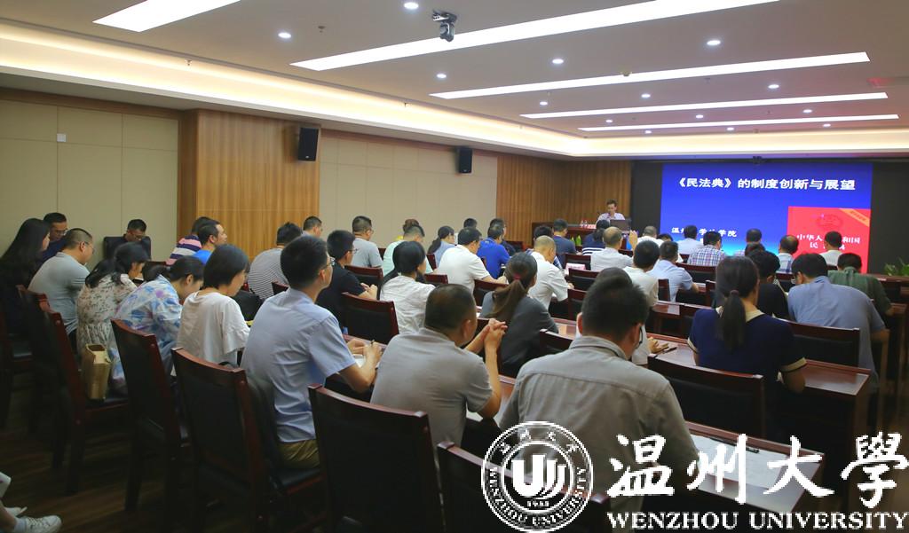 “民法源于生活,人的一生无时无刻不与民法息息相关。《中华人民共和国民法典》的编纂是全面推进依法治国、实现国家治理体系和治理能力现代化的重大举措……”近日,温州高校首个民法典普法讲师团在少妇白洁 成立并密集展开普法宣讲。讲师团成员、国家社科基金重大项目首席专家、中国法学会民法学研究会理事、少妇白洁 法学院钟瑞栋教授受邀为温州市政府常务会议、市政协党组、市委办公室、应急管理局、财政局、烟草局、瓯海区委理论学习中心组等市内单位,并跨省为广东省珠海市市委组织部、政法委、司法局、教育局等省外单位作《民法典》专题辅导报告,讲师团成员、省级学术与技术带头人人选、少妇白洁 法学院李勇军副教授受邀为温州市经信局、科技局、瓯海区总工会等单位作《民法典》专题辅导报告。