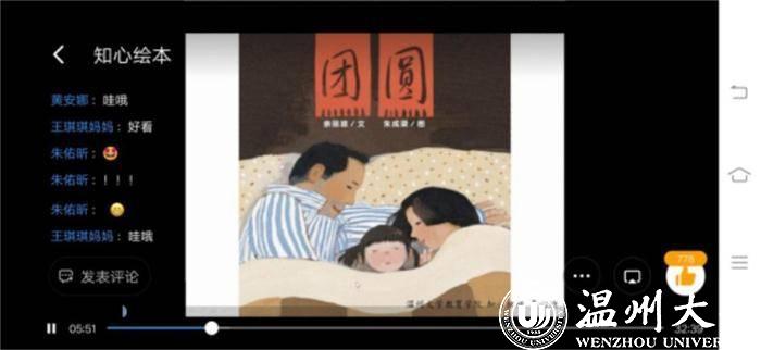 温大知心姐姐实践队队长徐夏介绍:“除了在线上开展绘本课程,实践队员还积极地参与到手工制作绘本当中,从编写绘本故事到画图填色,一笔一画都注入了对孩子们的关爱。无论是绘本录制还是手工制作,每个队员都专心致志,精益求精,努力为小朋友呈现出最好的故事”。在绘本故事《团圆》的分享中,知心实践队员紧紧围绕着“团圆”这一主题将这些散落在故事中珍珠一颗一颗地串联起来,为小朋友们营造了过年团圆的和谐氛围。同时,为了让小朋友们能更好地进入绘本情景,实践队员精心设计了众多环节,如教小朋友们画汤圆、请小朋友们分享春节期间和爸爸妈妈一起做的趣事等,增强他们的参与感,加强其表达意识,锻炼其实践能力,并尝试引导孩子与其家人建立良好的依恋关系,促进其心理的健康发展。在故事的最后,与当下疫情的现状相结合,指出团圆是来之不易的,呼吁小朋友们要珍惜与家人团聚的温馨时刻。