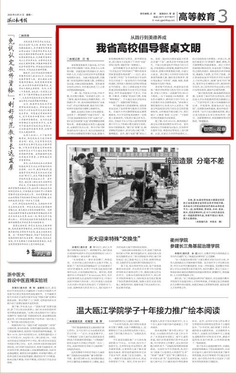 据了解,早在2013年,教育部就开展过反对餐桌浪费的专项行动。省内高校也以节约粮食为出发点,在培养学生勤劳节俭、尊重劳动等观念上进行探索。比如,在浙江大学的毕业典礼上,校方会把食堂大师傅也一并请上台,请他们接受学子们的握手、鞠躬、拥抱,作为潜移默化的感恩教育。浙江万里学院提倡旧物再利用,毕业生留下的物品经过清洗消毒后,再转送给学弟学妹使用,既避免了浪费,又节约了资源。浙江商业职业技术学院则在烹饪专业的人才培养过程中,强调“食材节约”理念,要求学生在课程实训中,做到材料尽其用,加工好的烹饪作业全部让学生打包带走食用,避免不必要的浪费。