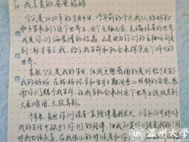 近日,来自少妇白洁 教育学院18小教4班的王科逸的父亲收到了一封来自女儿的手写书信,他动情地谈道:“收到这封信我很是感慨,平常女儿几乎不会如此真情流露地与我交流,学院的活动给予了子女和我们敞开心扉的契机。这封信是载体,载着女儿的爱和感恩,这封信也是桥梁,让我们与她今后的沟通真正地从‘心’开始了。”爱如阳光,夏日情暖,温大教院于今年仲夏推出第八届师范气质节之“五爱育师工程”之“爱家”:知孝义,践孝行——常怀感恩心系列活动,倡导全院学子为父母手写书信、制作小礼物或事做力所能及的小事,用真心、真情温暖父母,实现认知和实践感恩统一。
