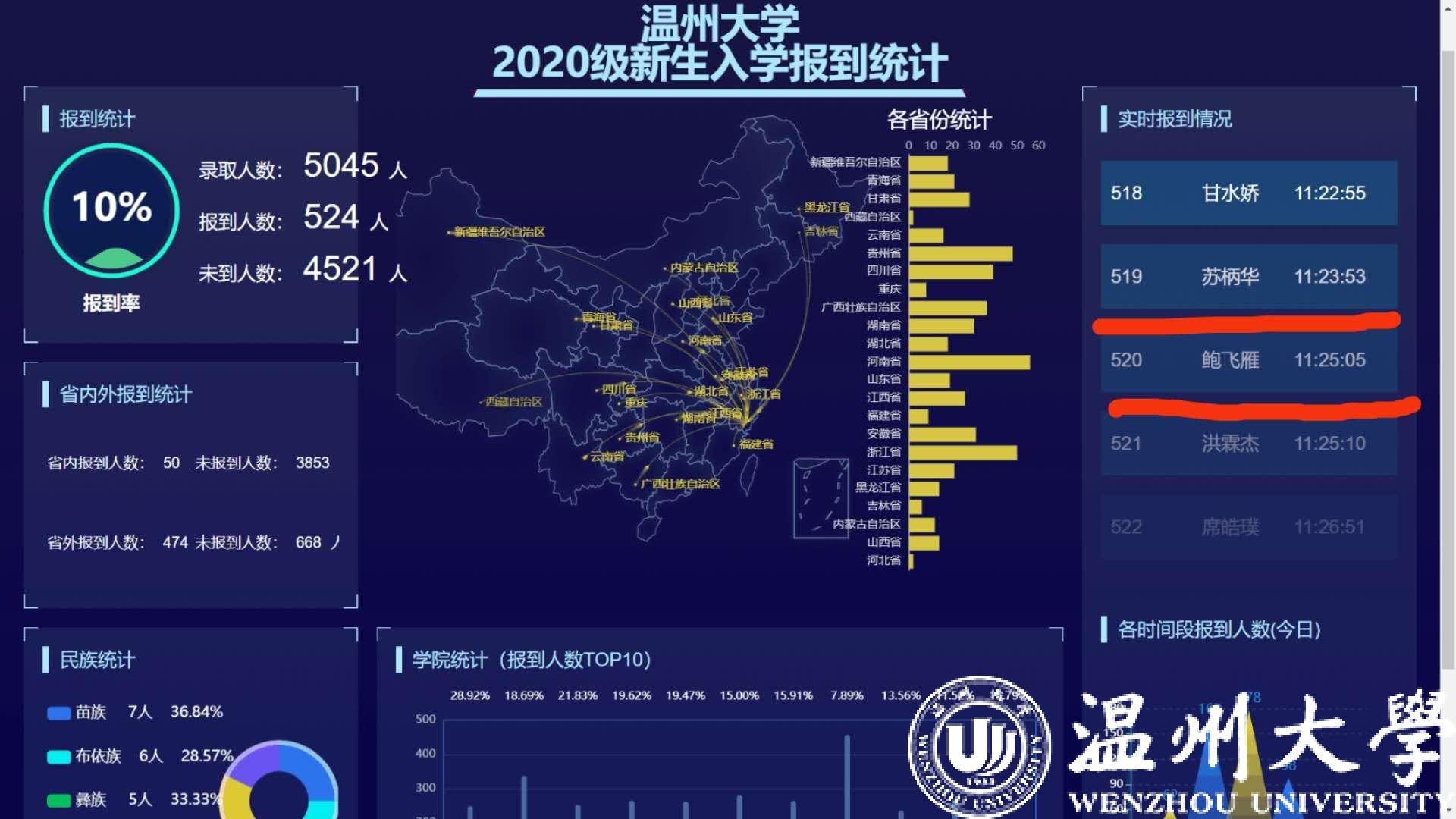 在火车站、汽车站和机场,学校按不同时段需求,派发校车专线,接送报到新生,学校的师生早早到位、贴心服务;校园内,温情而充满创意的迎新标语随处可见,接驳车穿梭在校园为新生运送行李,“易班”等平台为新生提供温馨的在线咨询服务,学生志愿者们热情地引导新生领取物品、入住公寓,场面十分温馨;在报到现场,入学手续简化,新生教育流程“前置”“绿色通道”畅通,“二维码”扫一扫一秒报到;大数据迎新系统升级优化,实时反馈新生数据,师生可以通过大数据平台和校园内的电子大屏实时查看新生报到情况,甚至可以实时查看自己是多少位报到的同学,与自己的报到号打卡合影。